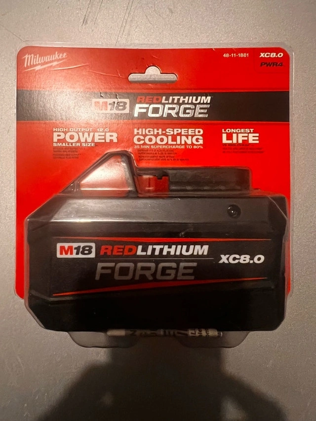 This Milwaukee M18 Redlithium Forge XC8.0 battery offers high output and high-speed cooling, with a 35-minute supercharge to 80%. It features High Output 12.0 Power, High-Speed Cooling, and Longest Life. This battery is ready to power your projects! If the ad is up, it's available! Cash accepted.