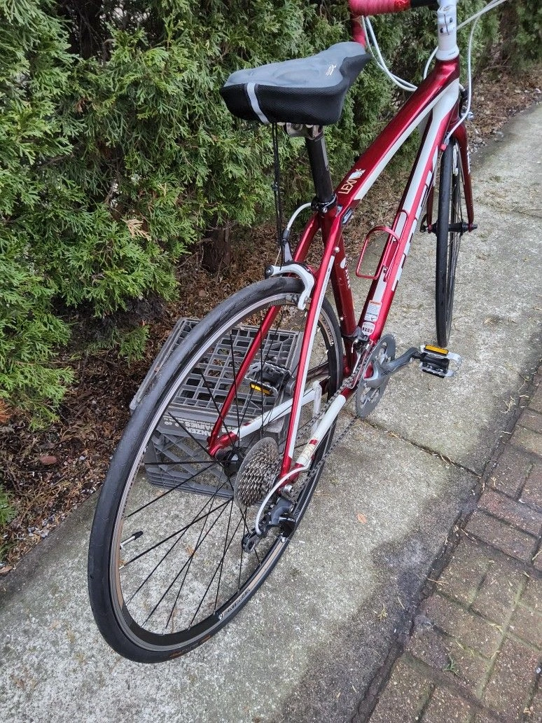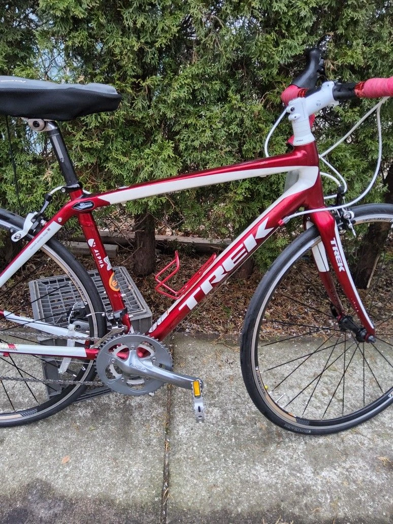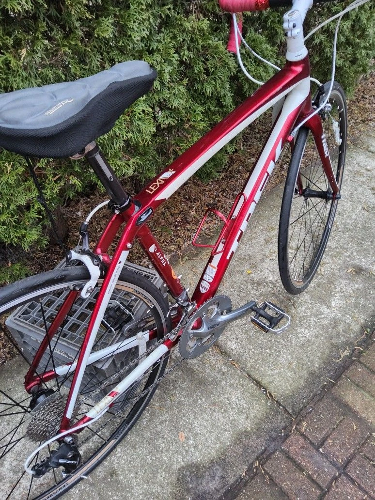 Selling a Trek Lexa SLX road bike in Bright Red Satin. This bike is in great shape and has been well-maintained. It features a lightweight aluminum frame with IsoSpeed technology for a smooth ride, paired with a carbon fork. Equipped with Shimano 105 shifters and derailleurs, Shimano Tiagra triple cranks, and Bontrager alloy wheels with a ten-speed cassette. It's ready to ride and perfect for endurance cycling. The bike has red handlebar covers and a black seat, as seen in the first picture. Feel free to message if you have any questions!