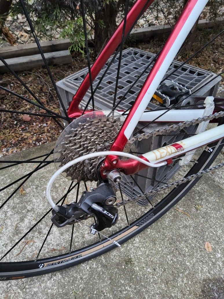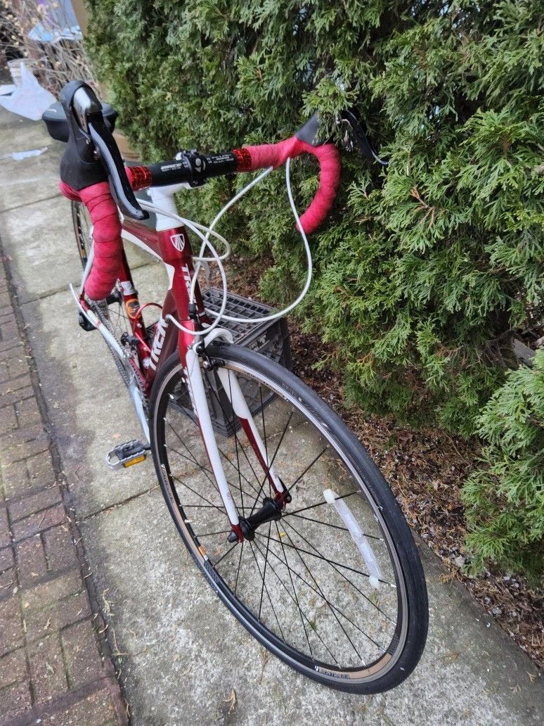 Selling a Trek Lexa SLX road bike in Bright Red Satin. This bike is in great shape and has been well-maintained. It features a lightweight aluminum frame with IsoSpeed technology for a smooth ride, paired with a carbon fork. Equipped with Shimano 105 shifters and derailleurs, Shimano Tiagra triple cranks, and Bontrager alloy wheels with a ten-speed cassette. It's ready to ride and perfect for endurance cycling. The bike has red handlebar covers and a black seat, as seen in the first picture. Feel free to message if you have any questions!