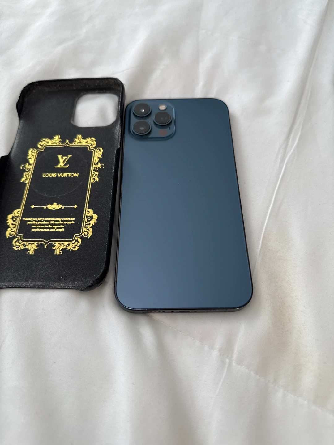iPhone 12 Pro Max comes with A Louis Vuitton case and charger in black monogram. Phone 12 Pro in blue. Excellent condition. Serious inquiries only.