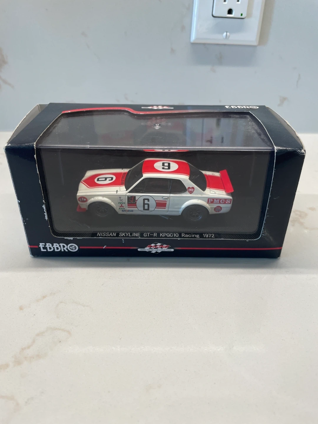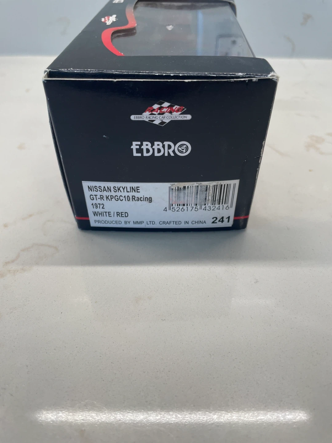 This is an EBBRO 1:43 scale model of the 1972 Nissan Skyline GT-R KPG C10 Racing car. It's white and red. This model is not a toy and is unsuitable for children under 16 years of age.