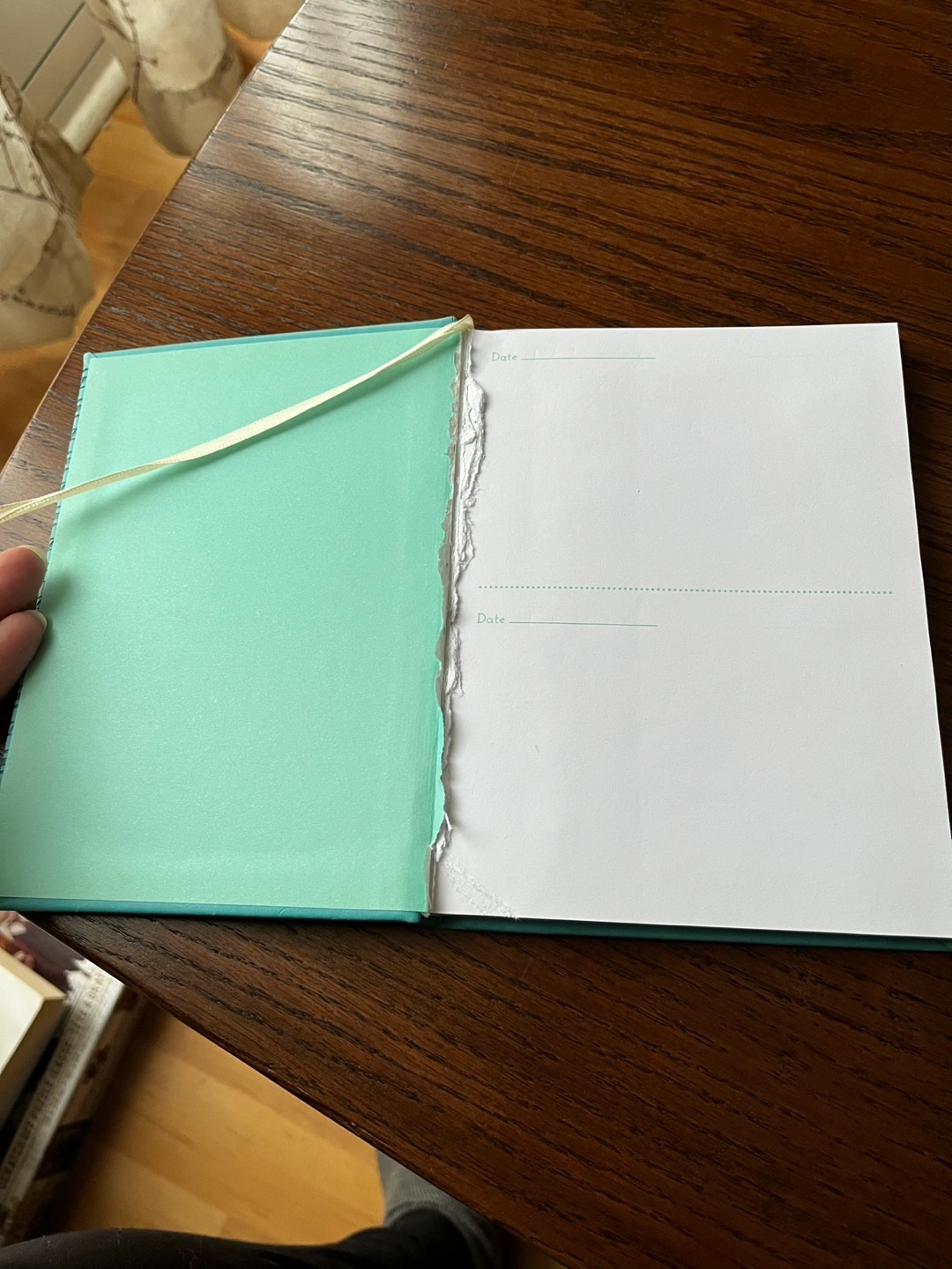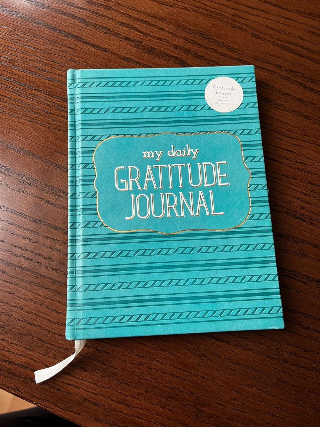Unused gratitude journal. Teal cover. Features lined pages for daily entries. Small tear along the binding from having removing personal pages.