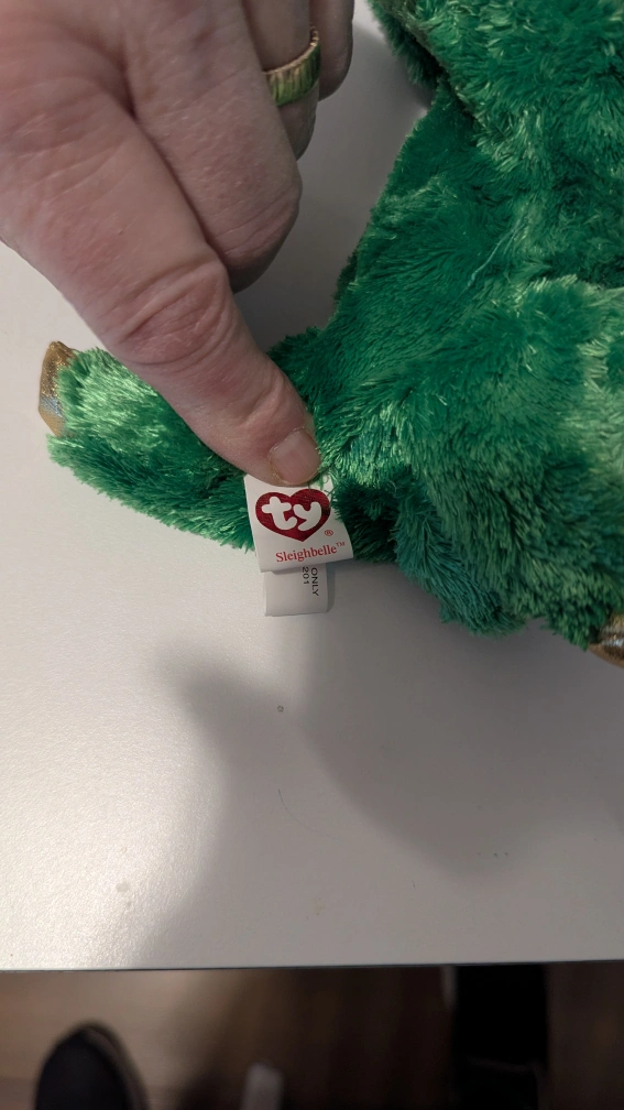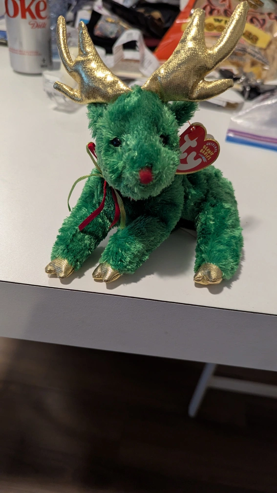 Green plush reindeer with gold antlers and hooves. Red ribbon around neck. Collectible Beanie Baby.