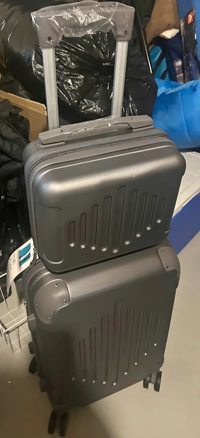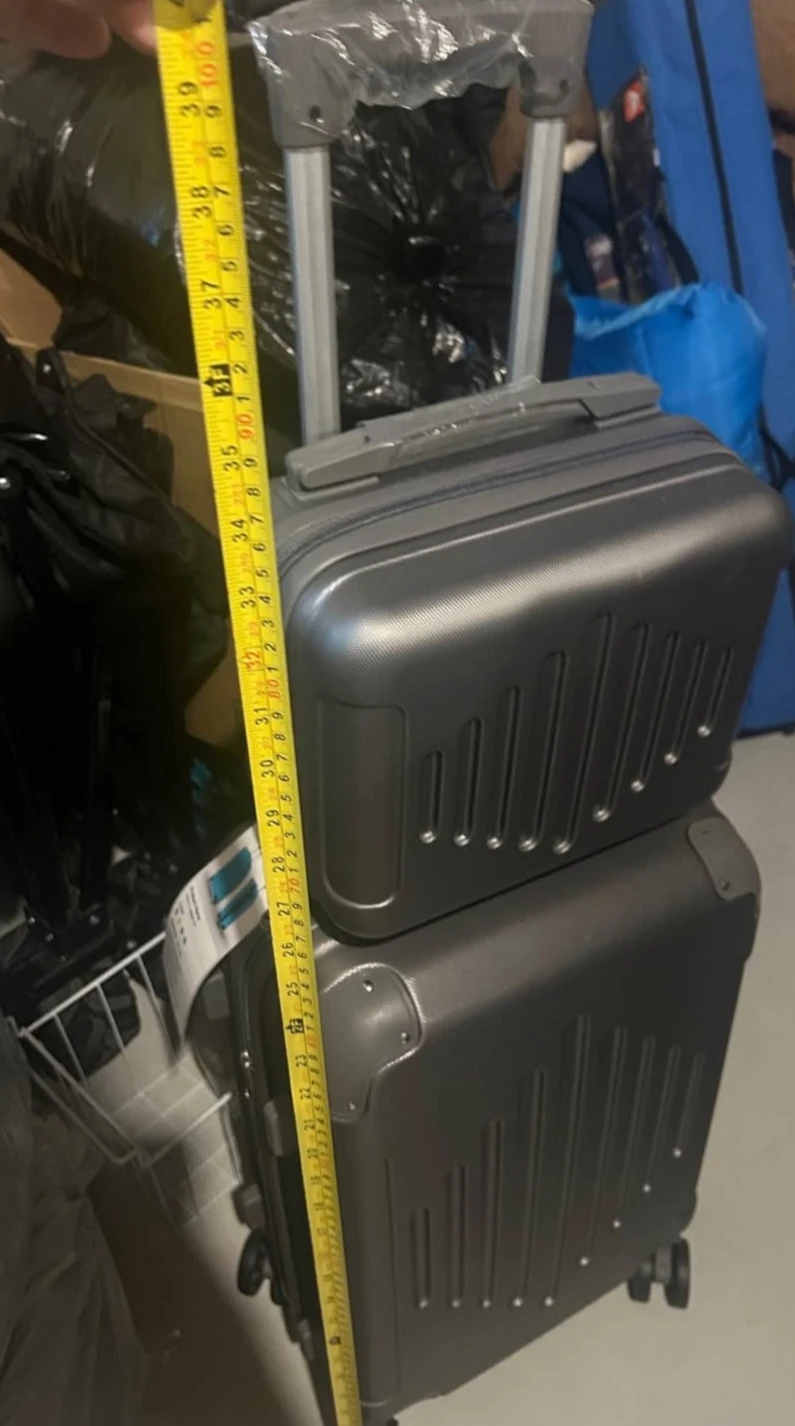 Two grey suitcases stacked. The larger suitcase is 20 inches tall and 14 inches wide. The smaller suitcase is 10 inches tall and 14 inches wide. Both are 8 inches deep and come with wheels and retractable handles.