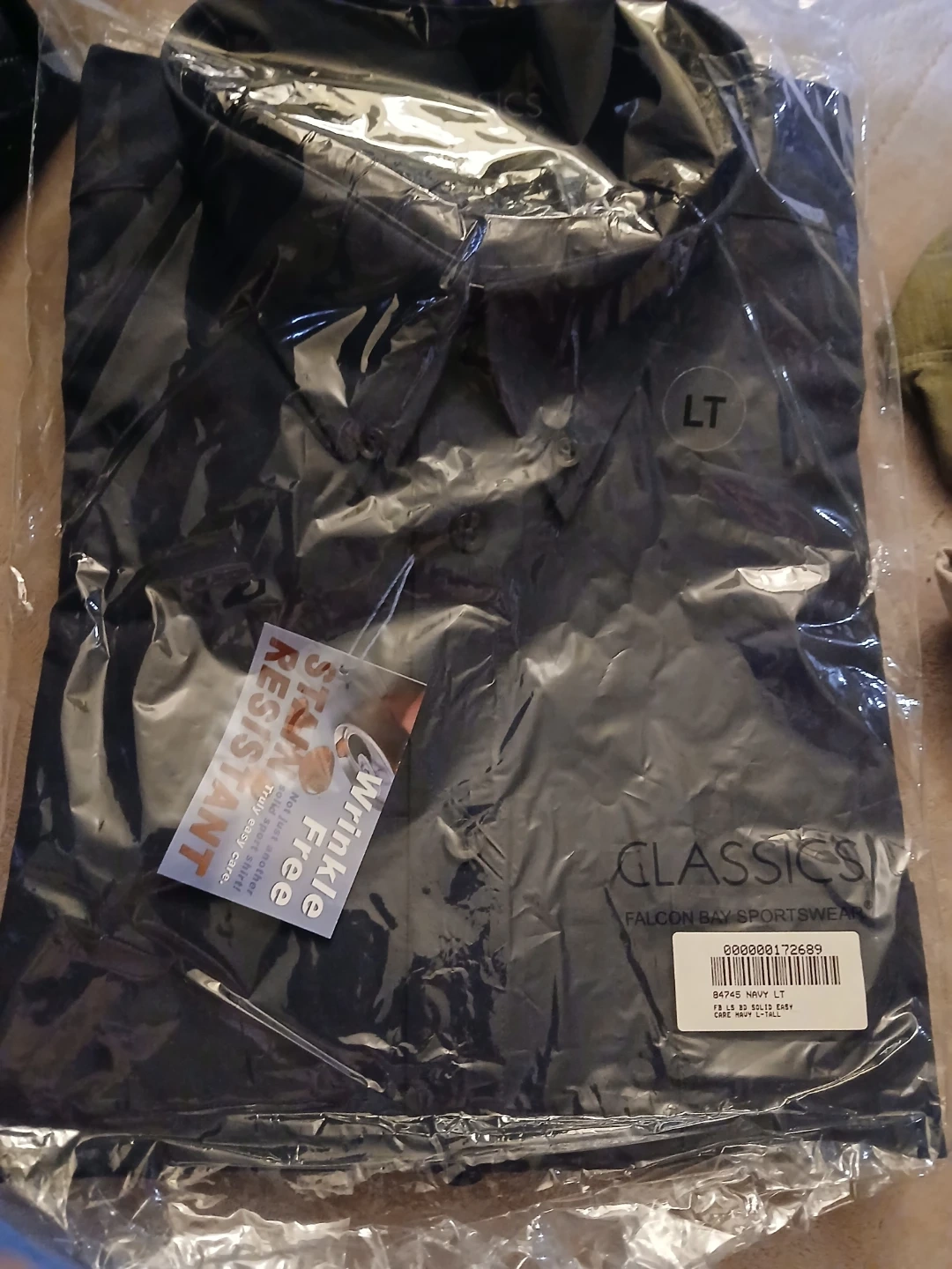 I also have a navy blue wrinkle-resistant shirt from Falcon Bay Sportswear in size LT, still in its original packaging!