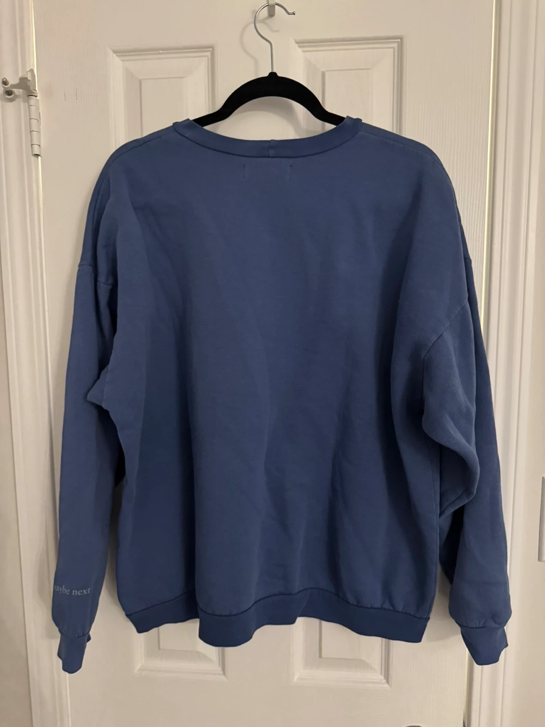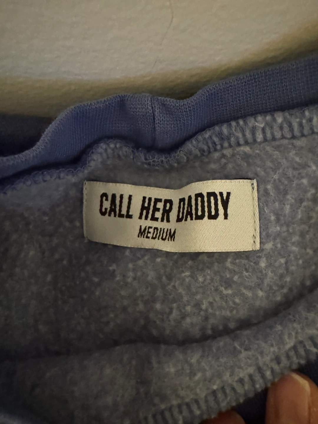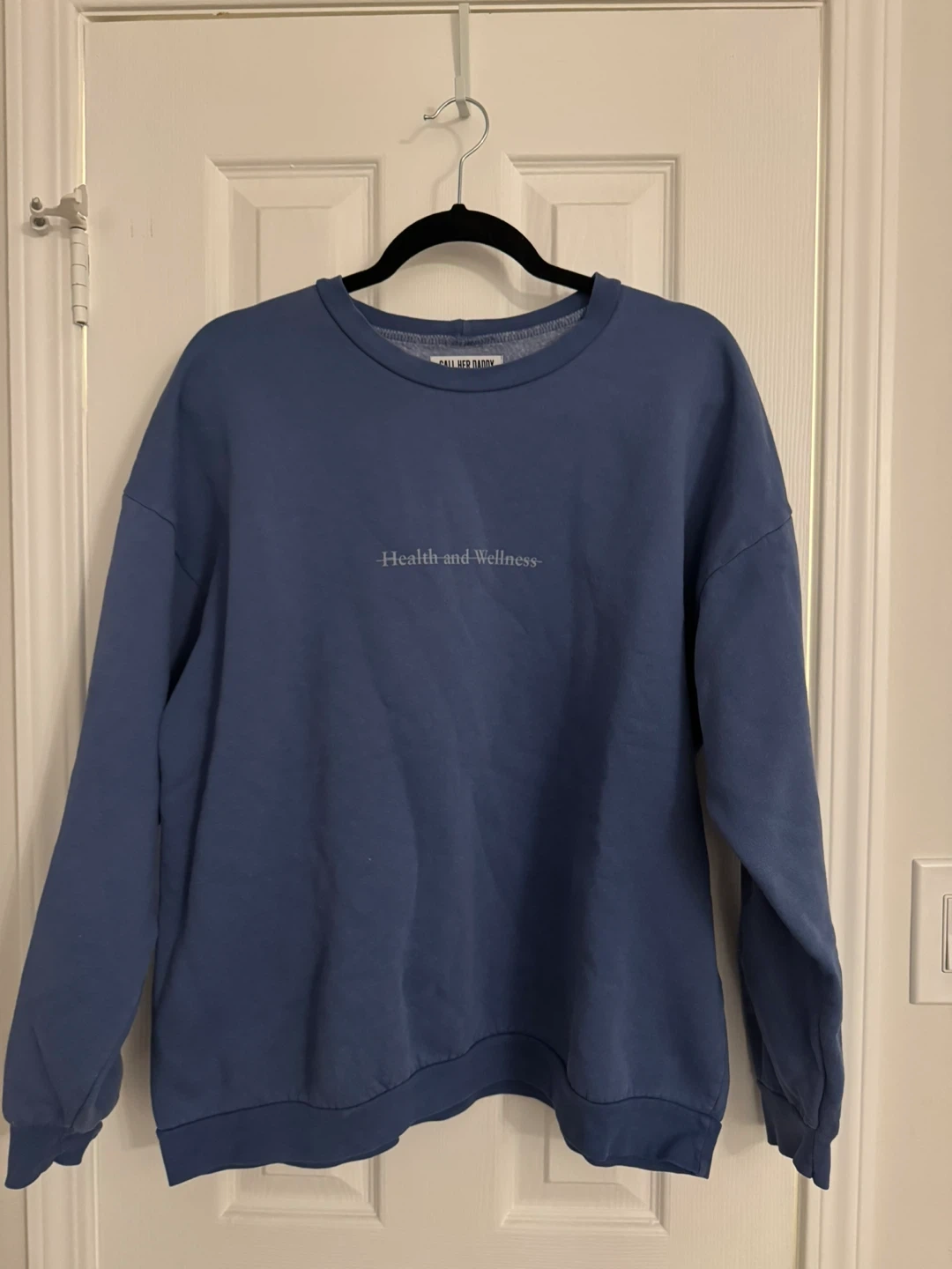 This blue crewneck sweatshirt from Call Her Daddy features "Health and Wellness" embroidered on the front. It's a size medium. The fleece material makes it super comfy!