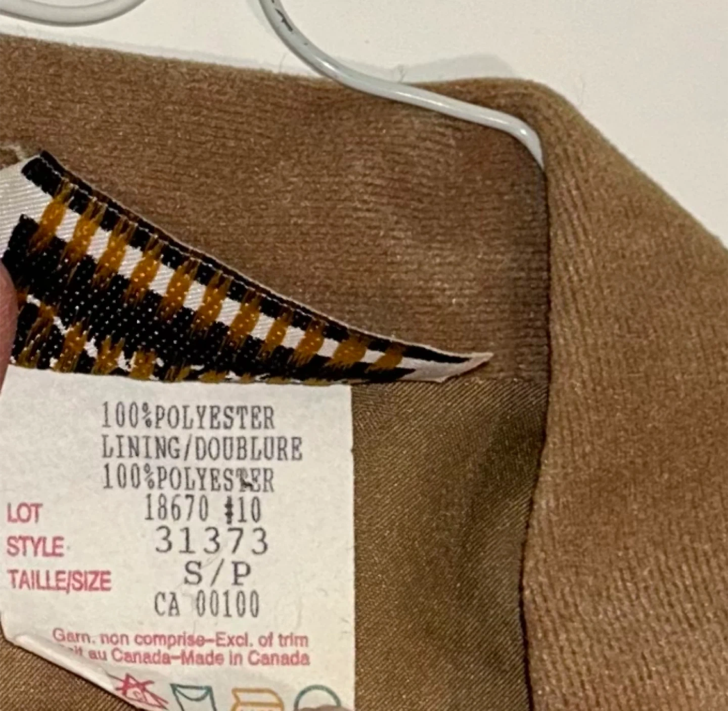 This camel brown vest is made of 100% polyester with a 100% polyester lining. It's a size S/P and features a tie in the back for an adjustable fit. Made in Canada. Great for layering!