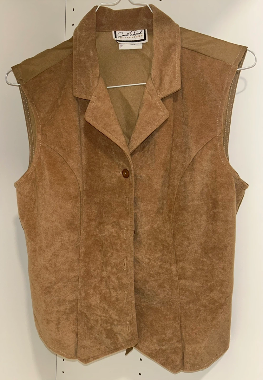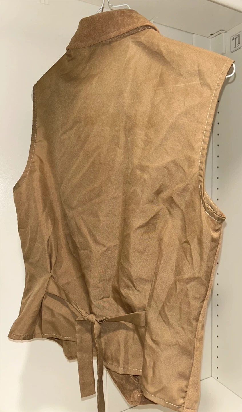 This camel brown vest is made of 100% polyester with a 100% polyester lining. It's a size S/P and features a tie in the back for an adjustable fit. Made in Canada. Great for layering!