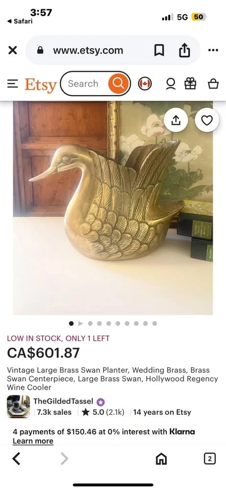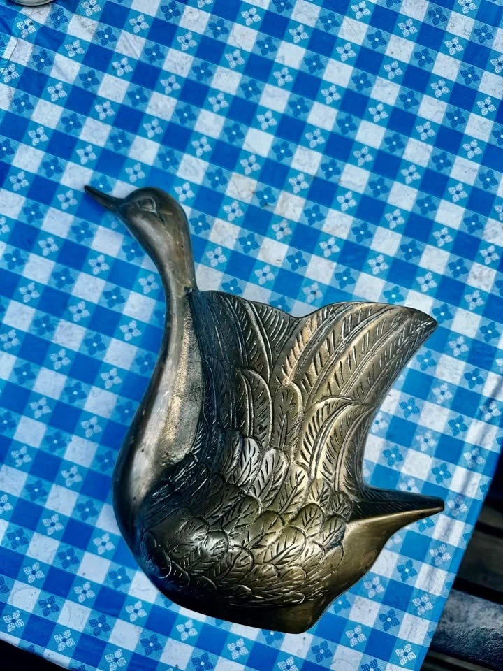 Brass - gold tone (photographing dark here). Elegant design. Rare, especially because the beak is pointing up. 1960s Hollywood Regency Design. Can be used as a planter, vase, or to cool a bottle of wine. See Etsy photo for comparison.