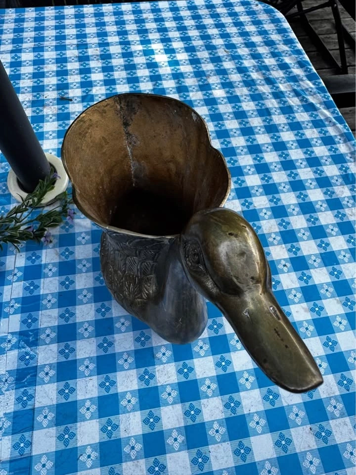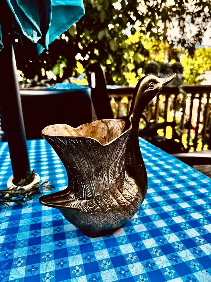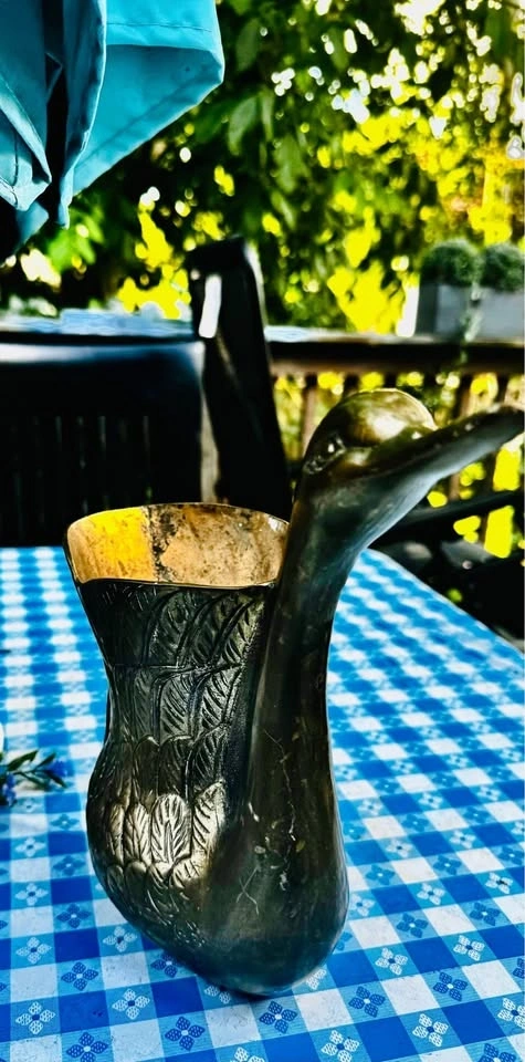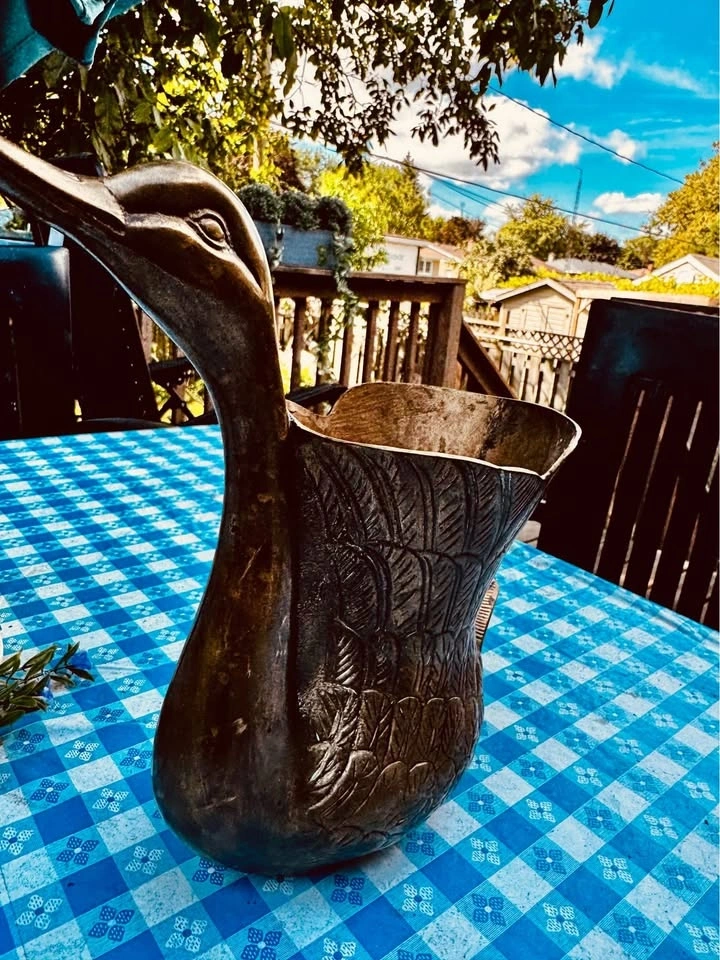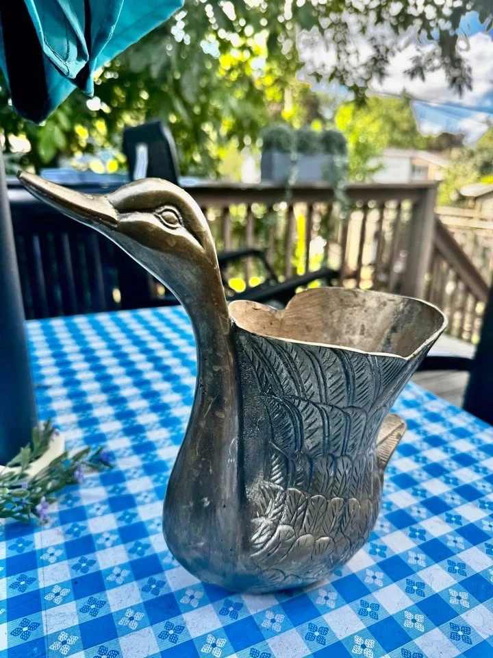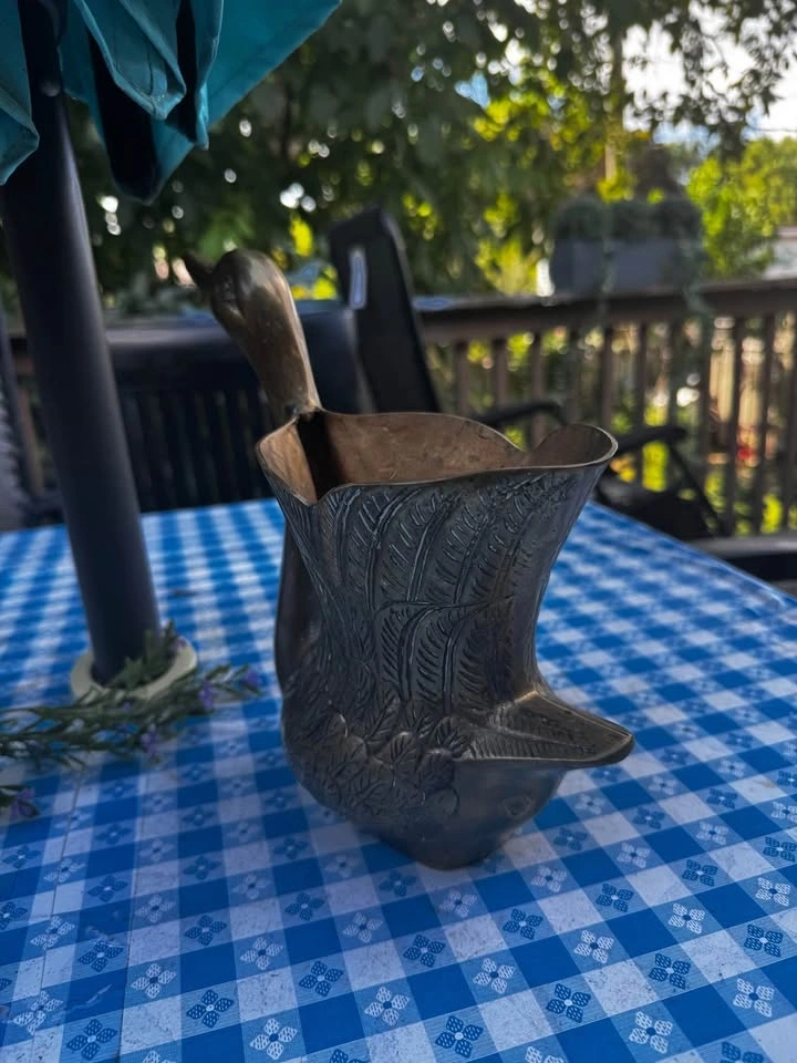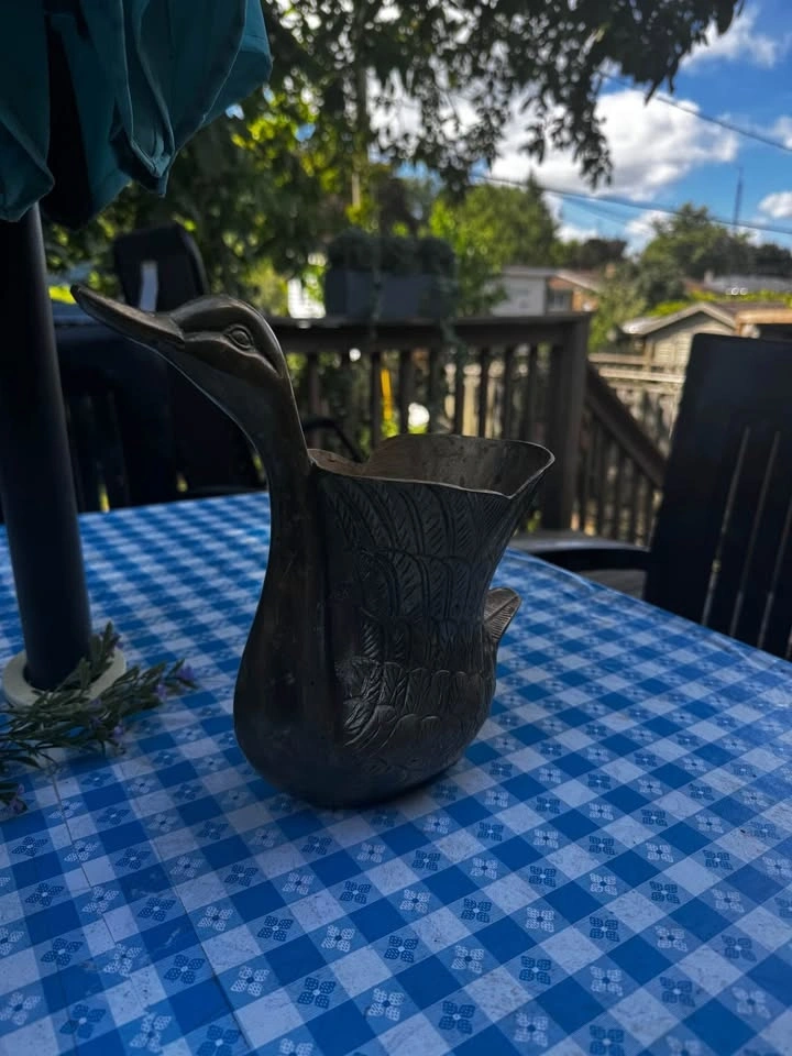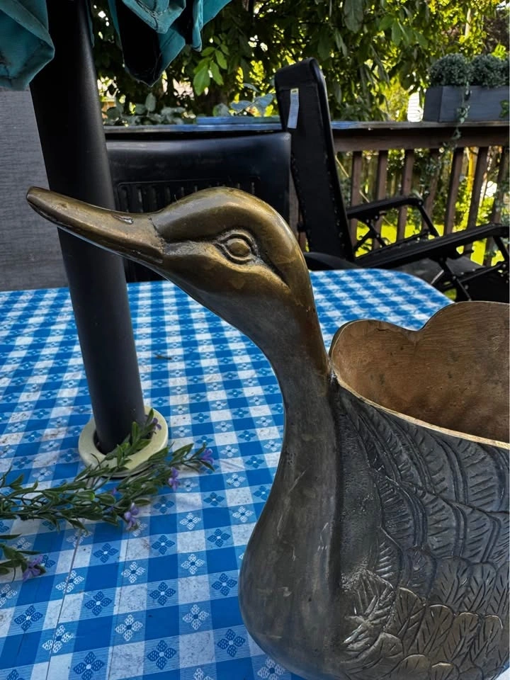 Brass - gold tone (photographing dark here). Elegant design. Rare, especially because the beak is pointing up. 1960s Hollywood Regency Design. Can be used as a planter, vase, or to cool a bottle of wine. See Etsy photo for comparison.