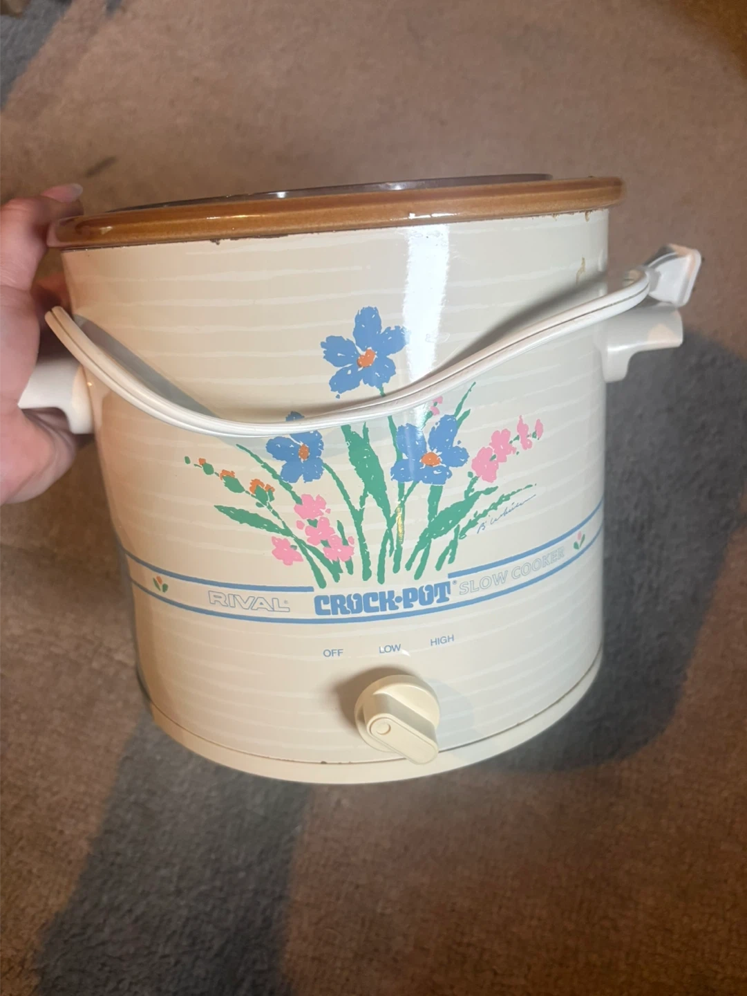 This is a Rival Crock-Pot slow cooker. It has settings for off, low, and high. The ceramic insert is removable for easy cleaning.