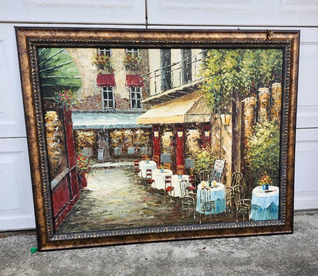 Oil painting depicting a charming Parisian cafe with outdoor seating. It's framed and ready to hang. This artwork would be a lovely addition to any home decor!