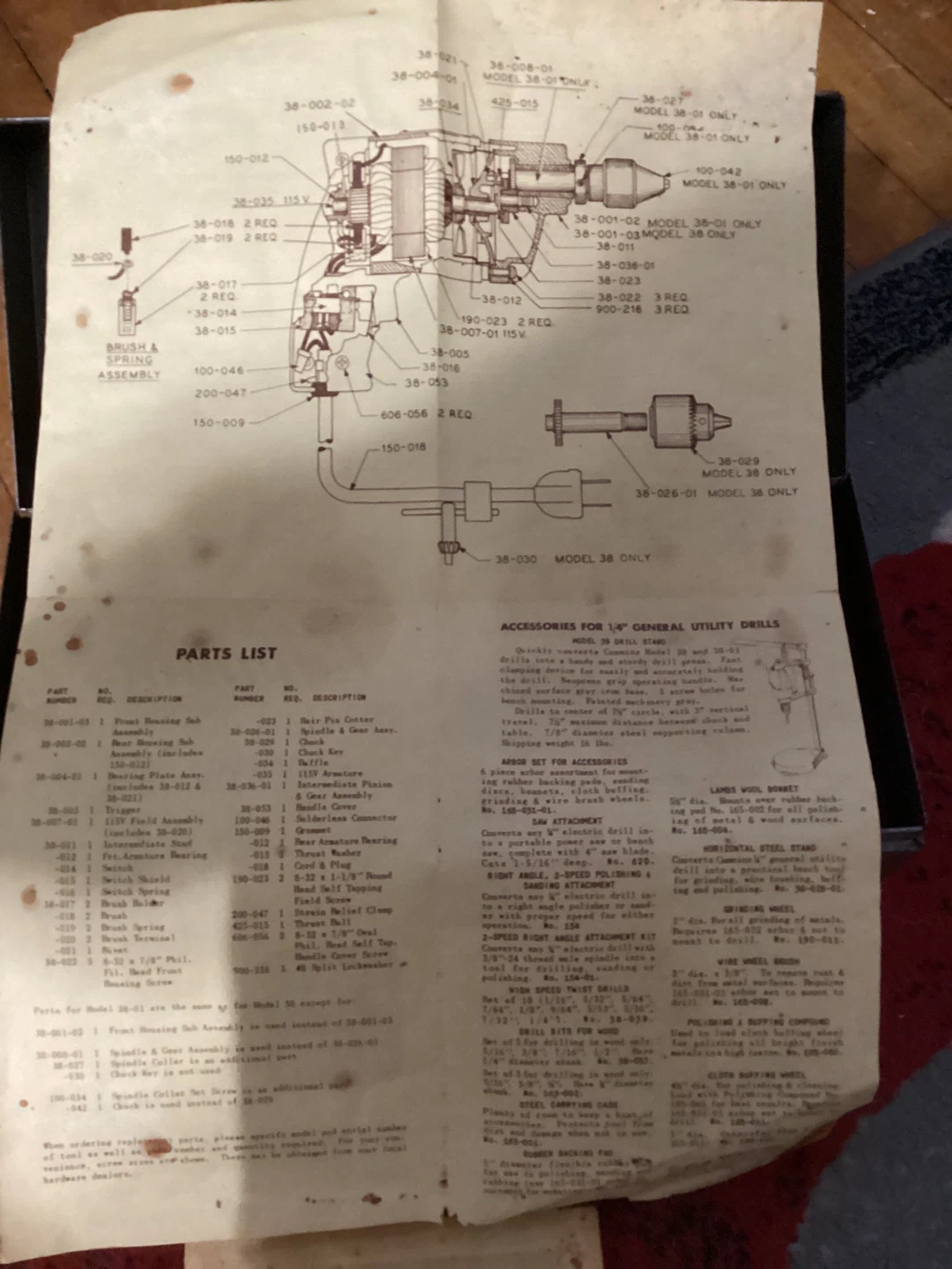 This is a vintage Cummins portable drill kit, model 38 & 38-01, for general utility use. It comes with the drill, a metal carrying case, operating instructions, parts list, and a set of drill bits. The drill appears to be in working condition and includes the original case and documentation.