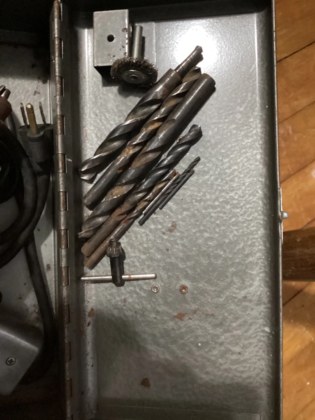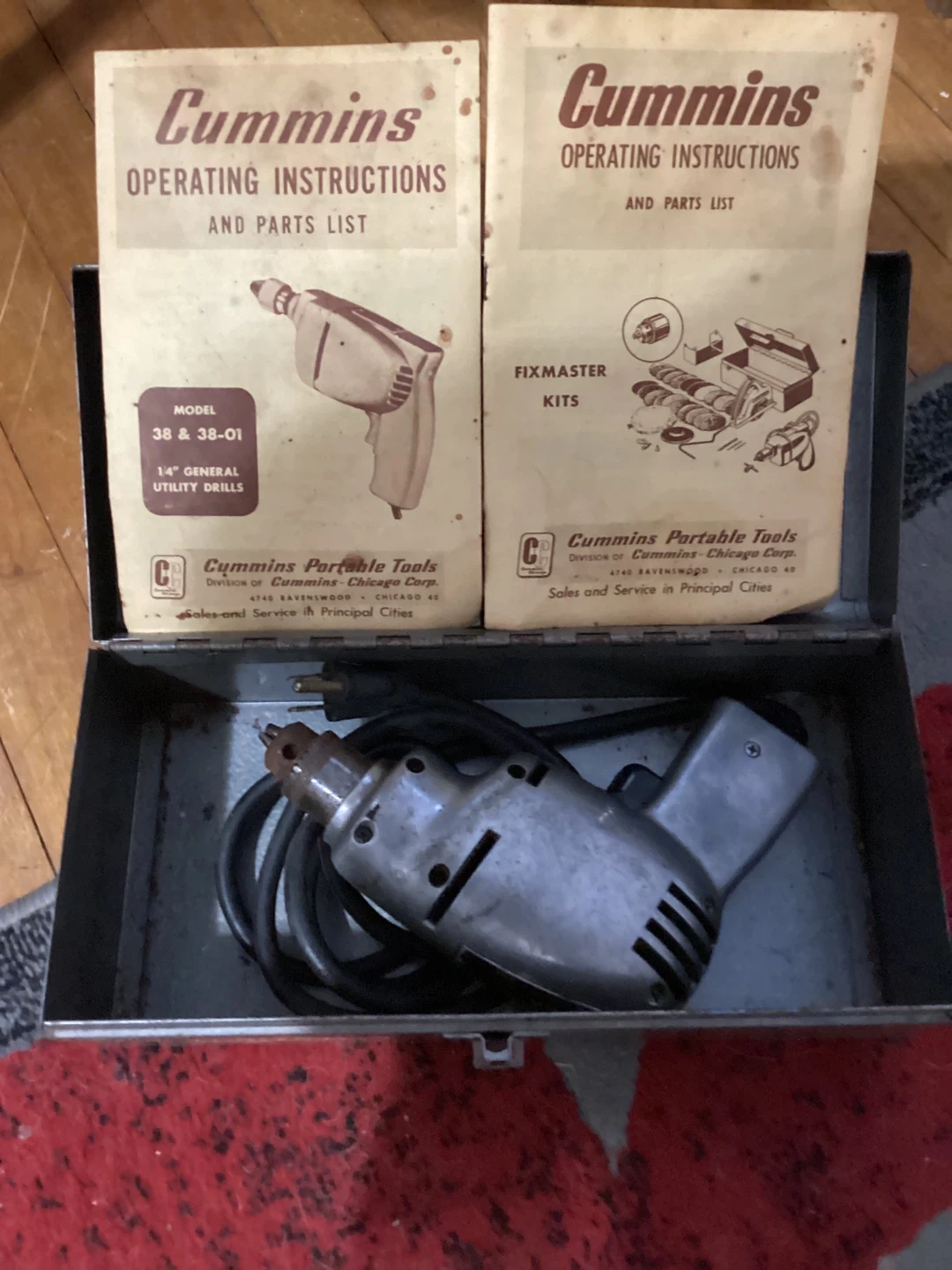 This is a vintage Cummins portable drill kit, model 38 & 38-01, for general utility use. It comes with the drill, a metal carrying case, operating instructions, parts list, and a set of drill bits. The drill appears to be in working condition and includes the original case and documentation.