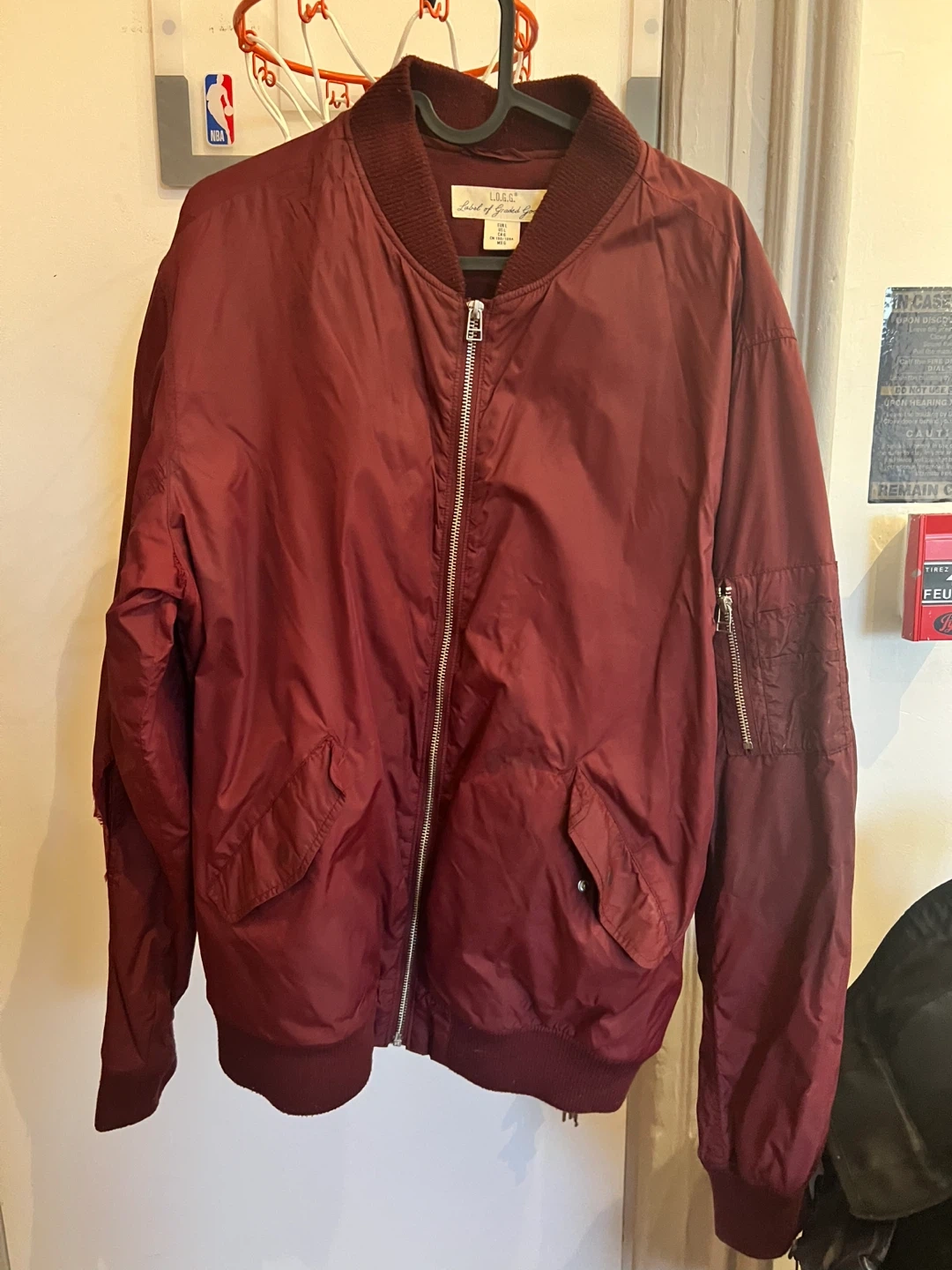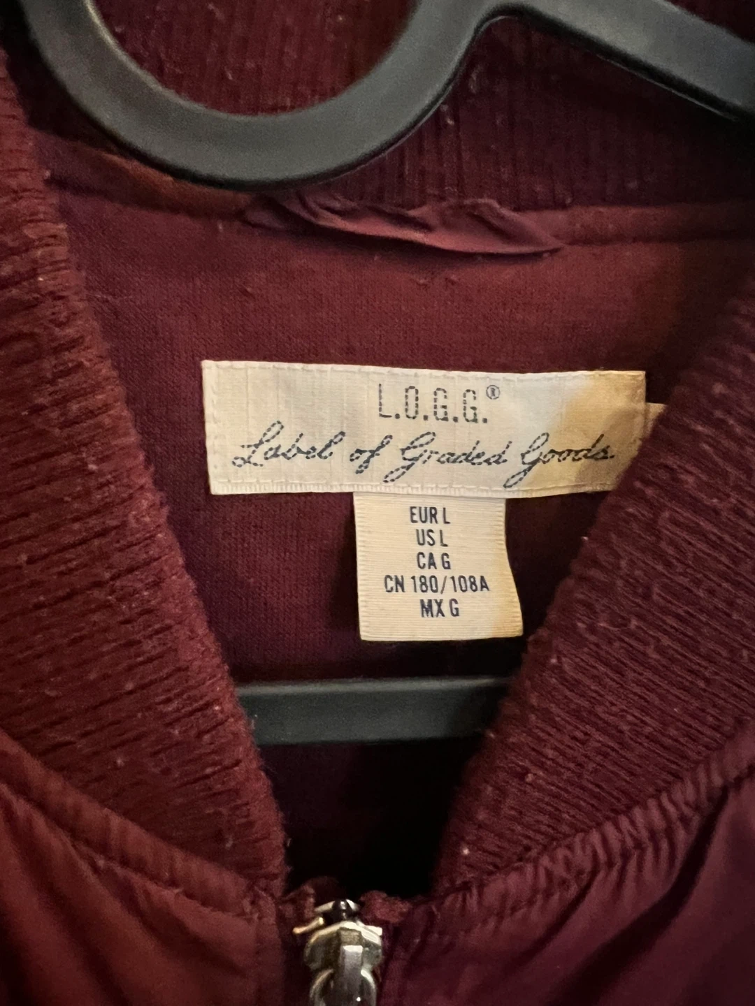 Burgundy L.O.G.G. bomber jacket. Size L, EUR L, US L, CAG. Made with polyester blend material. Features a full zip front, two front pockets, and a zippered sleeve pocket. Ribbed cuffs and hem.