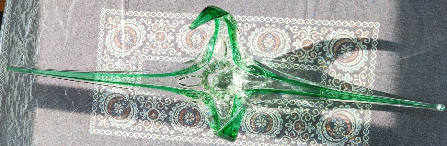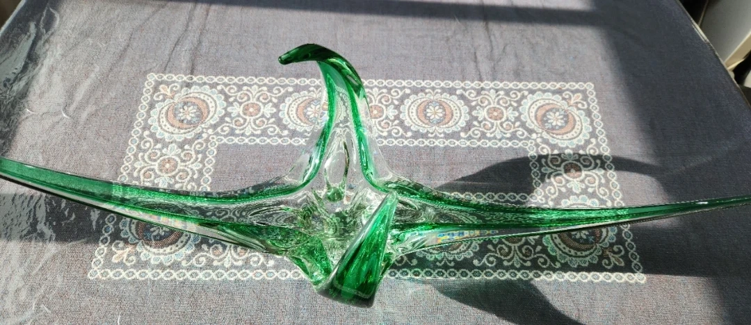 This striking green glass piece boasts an abstract, sculptural design. Its artistic form makes it a fantastic decorative item. Glass material. Smoke free no pets. 1960s.