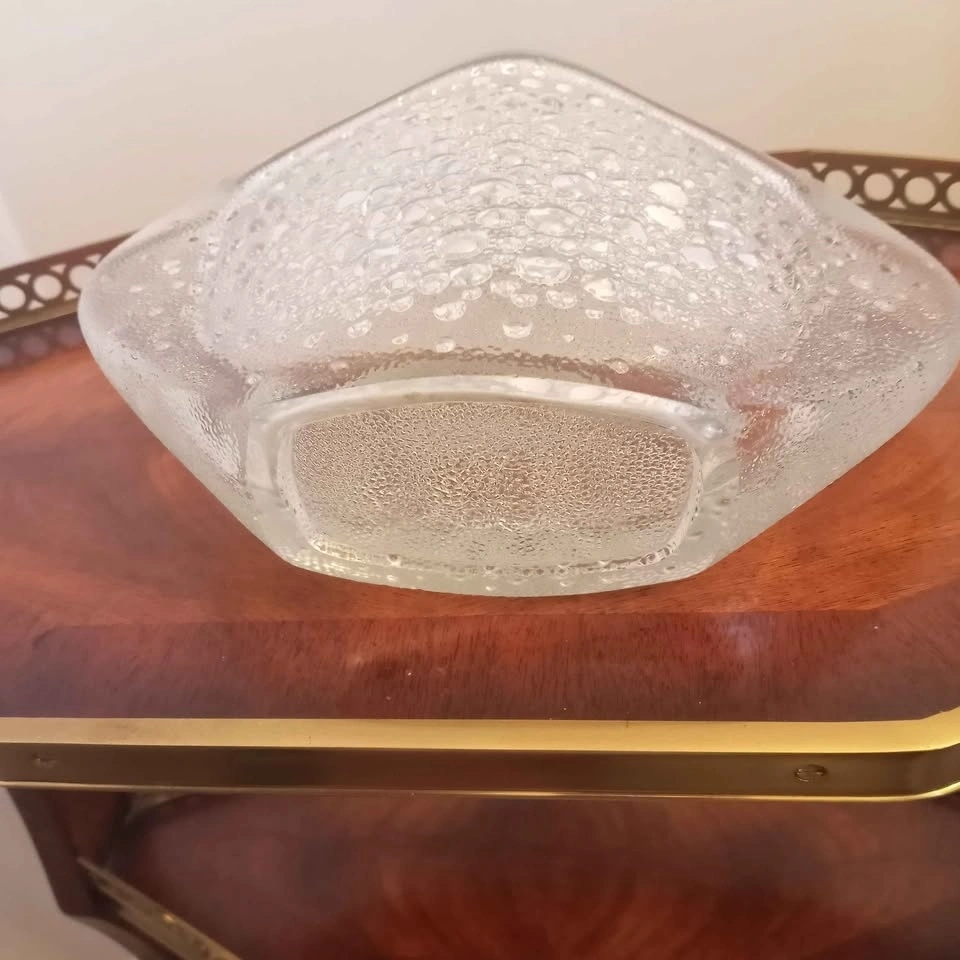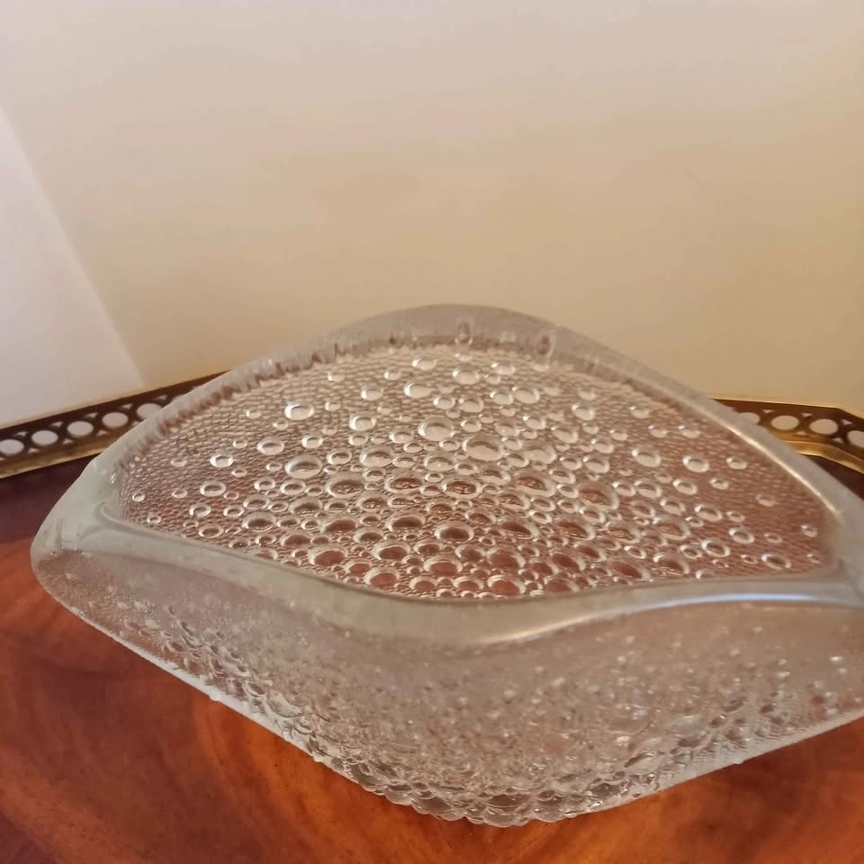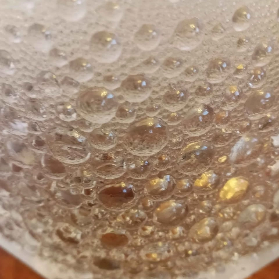 An iconic piece of Polish mid-century modern design. A flattened oval disk shape frosted with 3D bubbles, resembling a star constellation which gives it its name "asteroid".