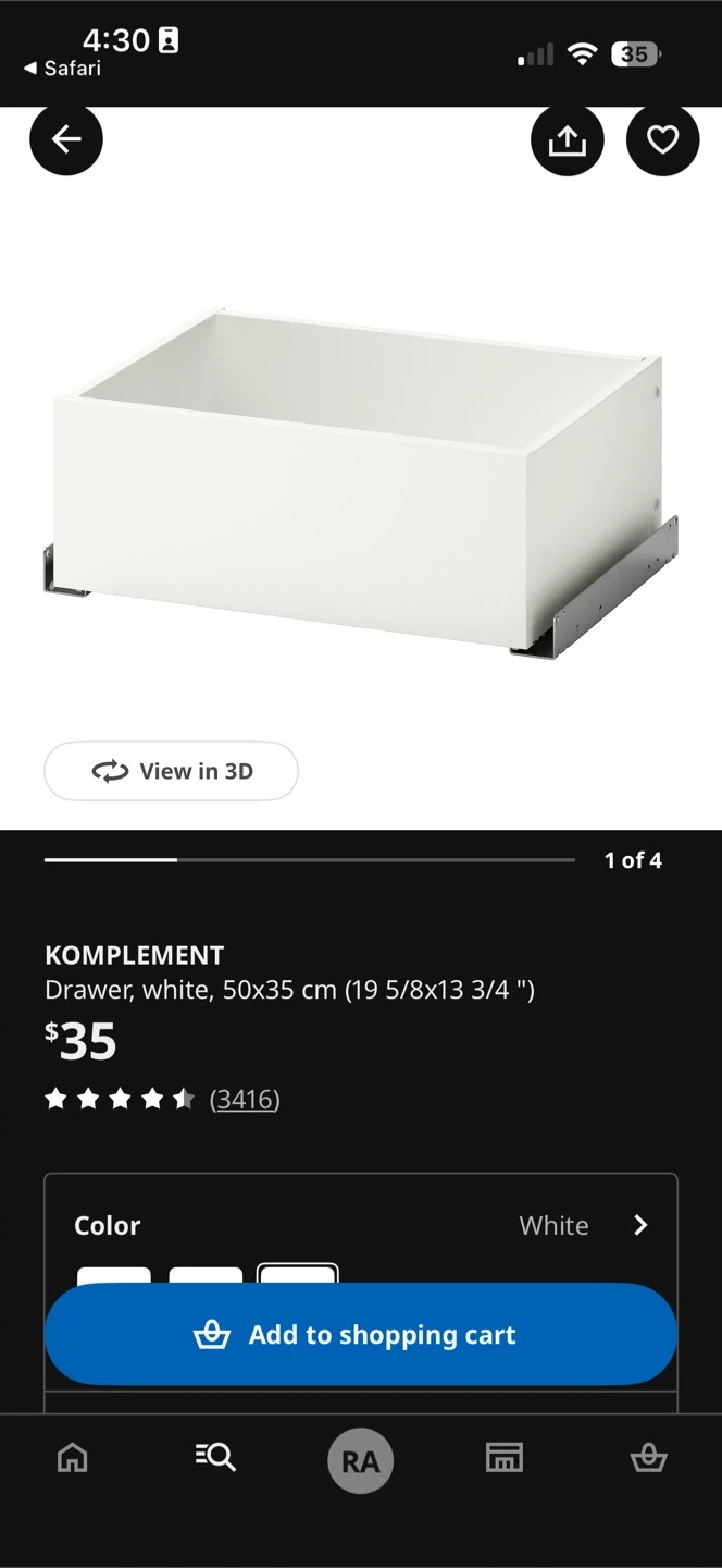 Buy & SellIKEA KOMPLEMENT Drawer White 50x35 cmIKEA KOMPLEMENT Drawer White 50x35 cm$11I have 2 unused white IKEA KOMPLEMENT drawers. It measures they are 50x35 cm. It includes drawer slides.ConditionLike newWHERE TO MEETJones Public LibraryView MapSELLERverifiedRyanLeslieville762 reviews0 chats·1 favorites·70 viewsSEND CHAT TO SELLERHi Ryan! I’m interested in your listing.Hi Ryan! I’m interested in your listing.Get the Karrot app to chatSign In to chat