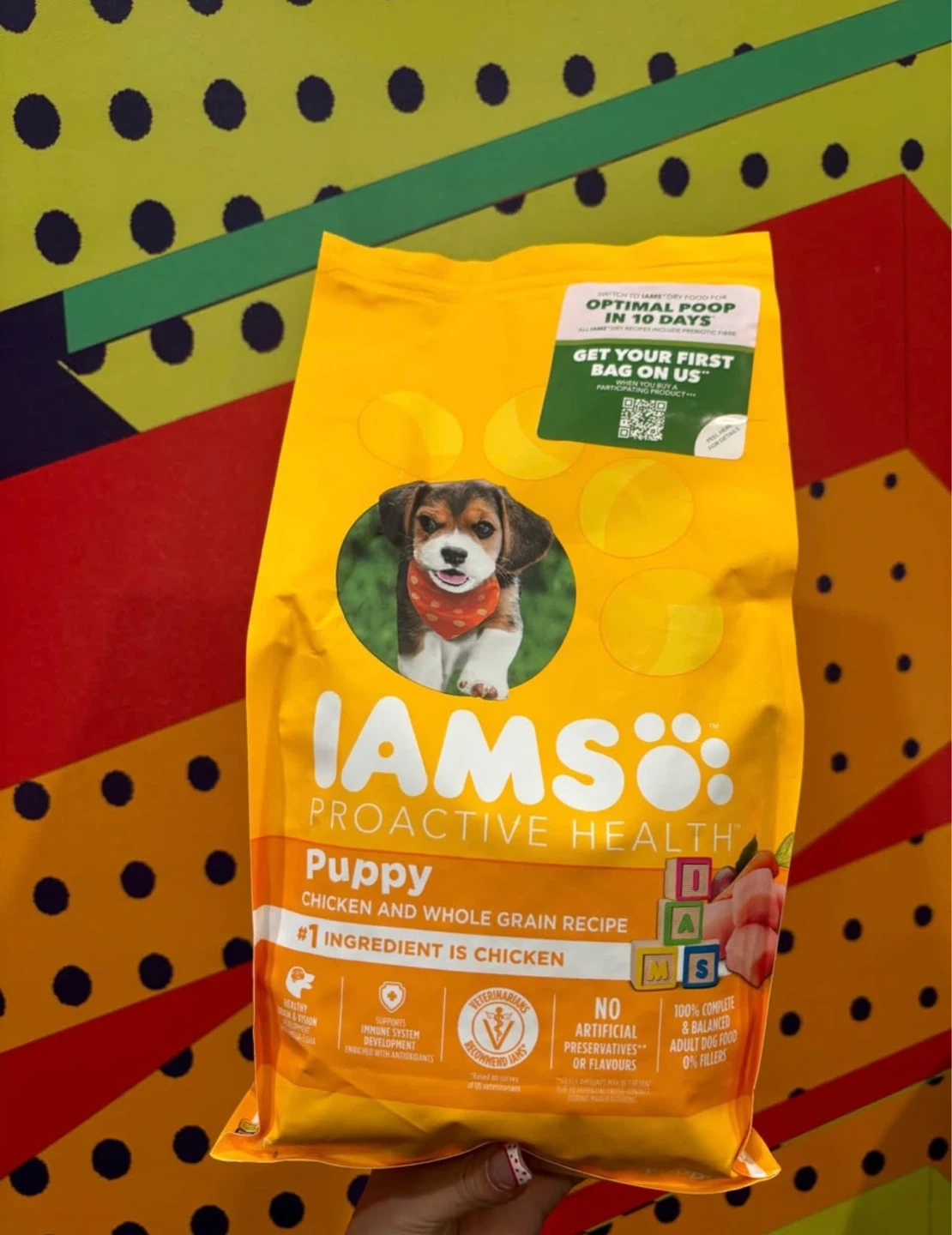 Iams Proactive Health dry dog food for puppies. Chicken and whole grain recipe with chicken as the #1 ingredient. Supports healthy brain and vision development. No artificial preservatives or flavours, and 0% fillers.