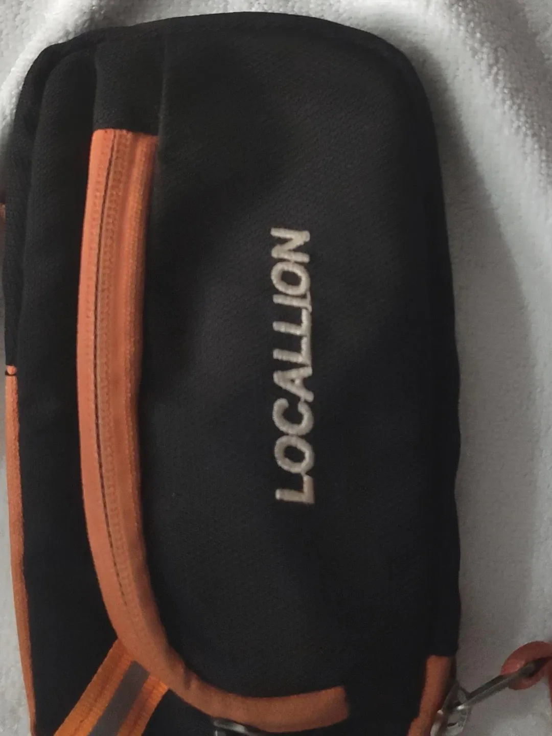 This is a LOCALLION pouch with a black and orange design. It's made of durable material and has a zippered closure. Perfect for carrying small essentials on the go!