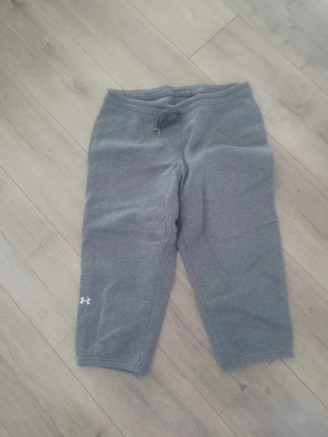 Grey Under Armour athletic capris with a drawstring waist. Made of a soft, comfortable material. Great for workouts or casual wear!