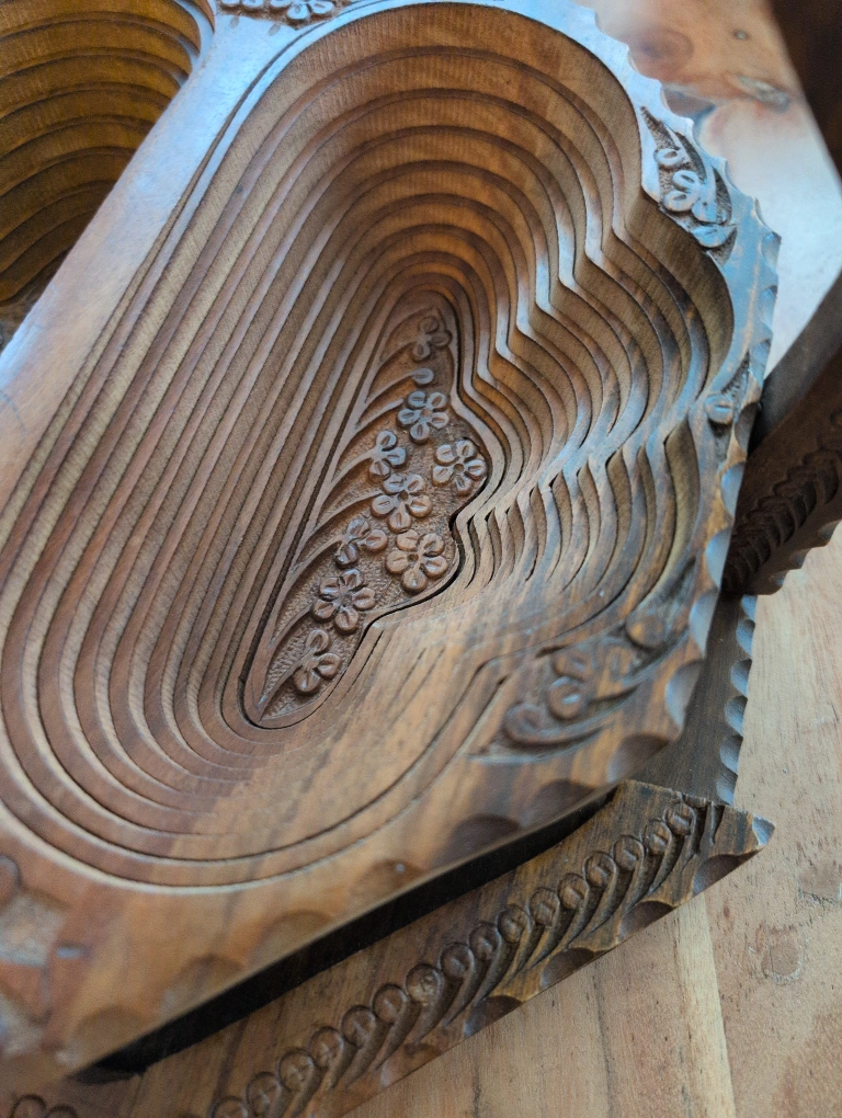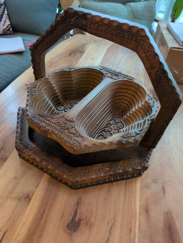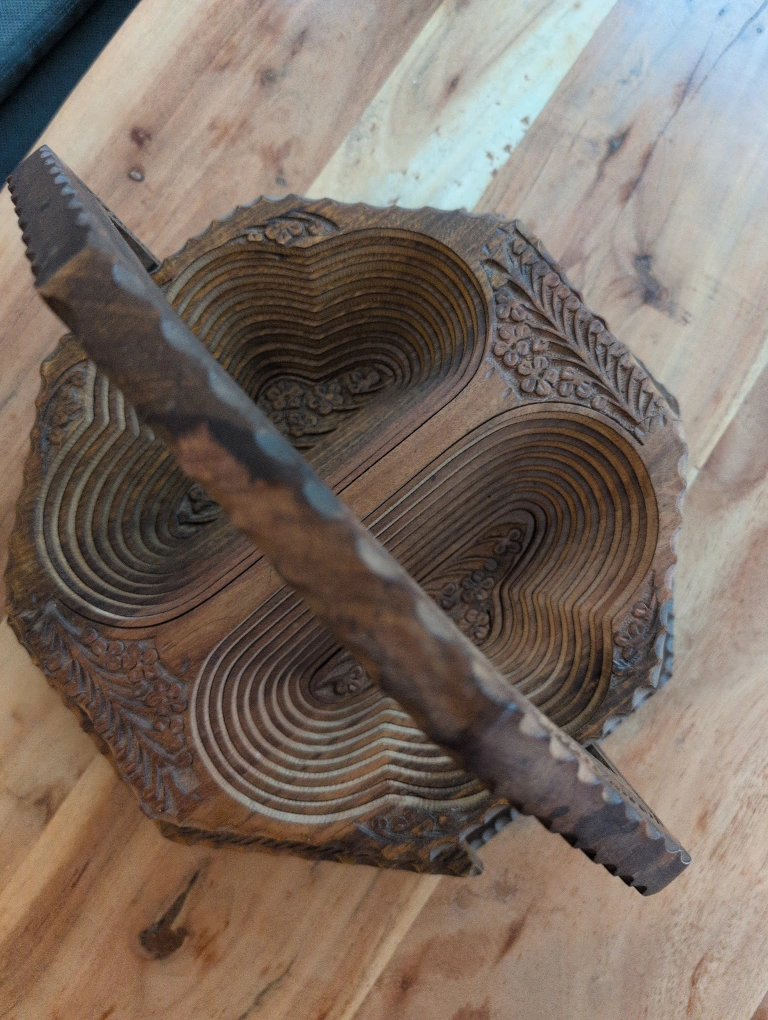 Beautiful intricate wooden folding basket or bowl. It has a unique design with floral carvings. Perfect for adding a unique touch to your home decor and serving baskets / platters.
