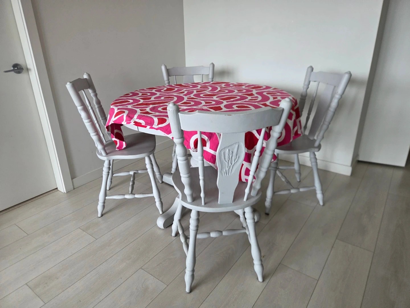 The set shows minor signs of regular use (a few scratches), but nothing that takes away from its charm. Or even perfect for using that beautiful table cloth that you haven't use in a while. It’s also a great opportunity if you enjoy DIY or refinishing projects—perfect for a fun summer refresh!