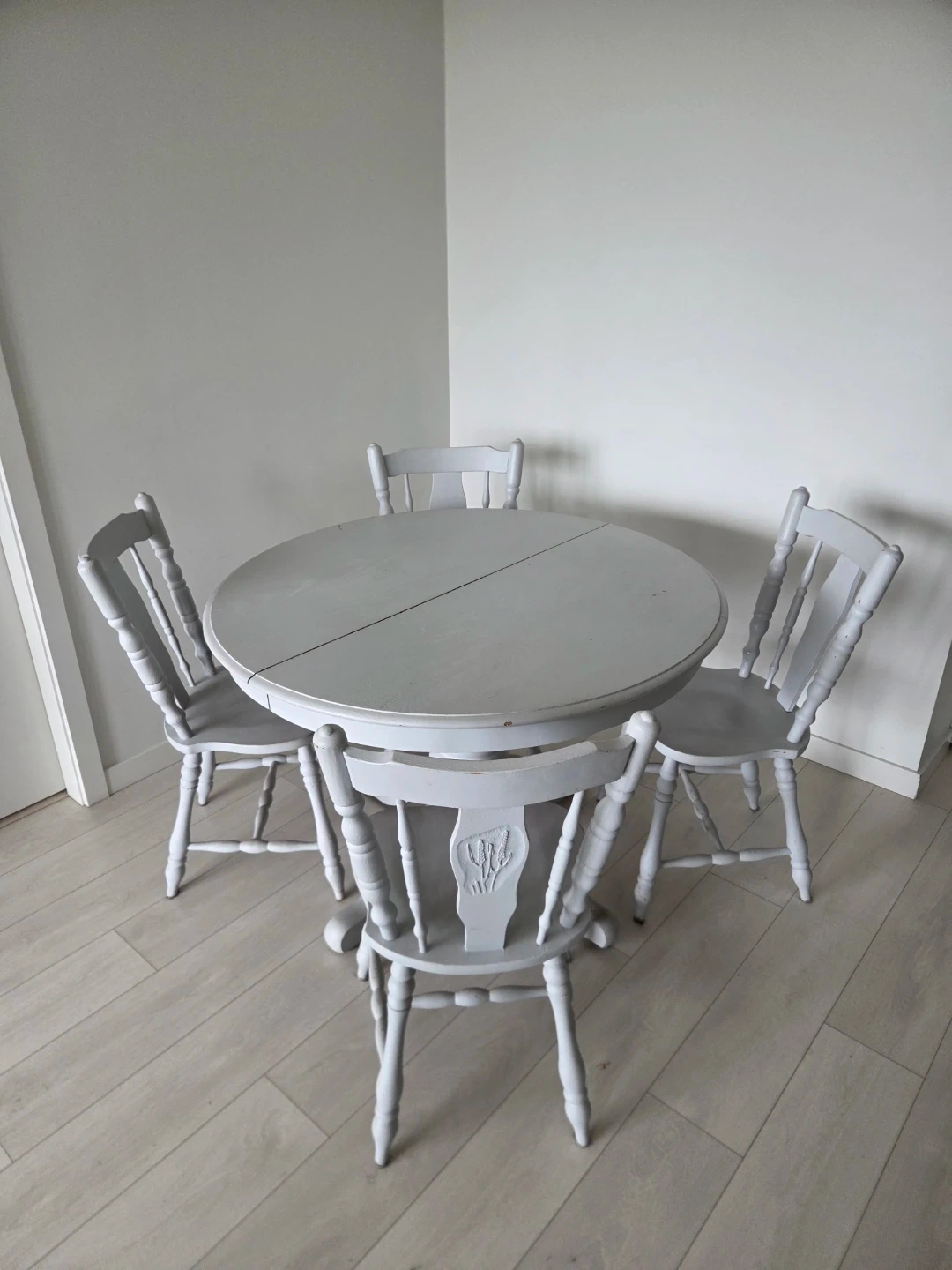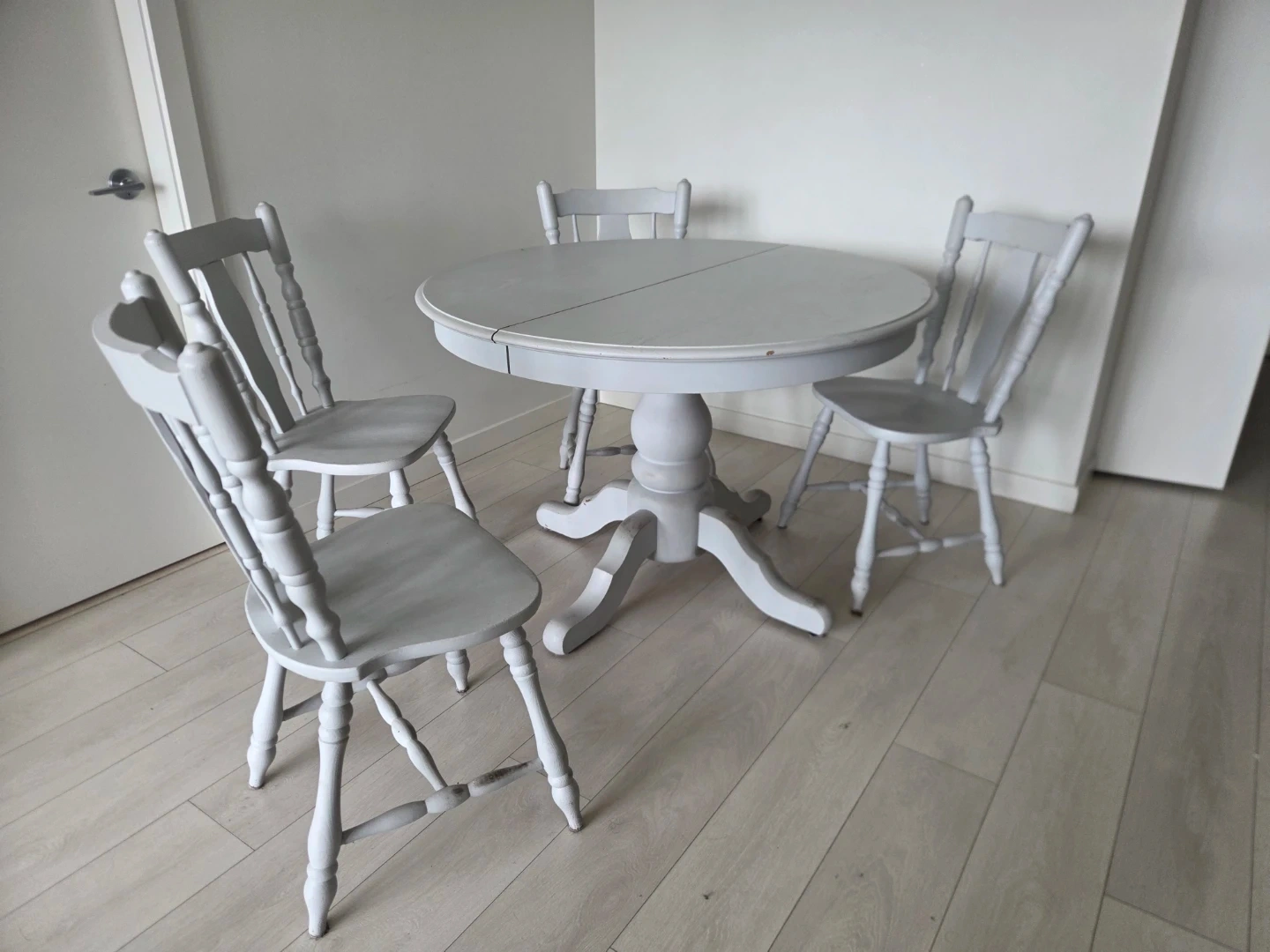 Beautiful light grey/off-white round dining table with four matching chairs, perfect for a cozy breakfast nook or dining area. The chairs feature classic spindle backs and elegant decorative detailing that add a timeless touch to any space.