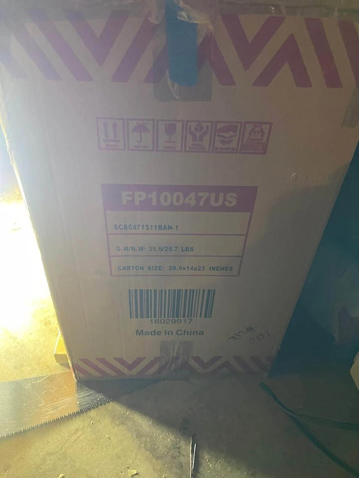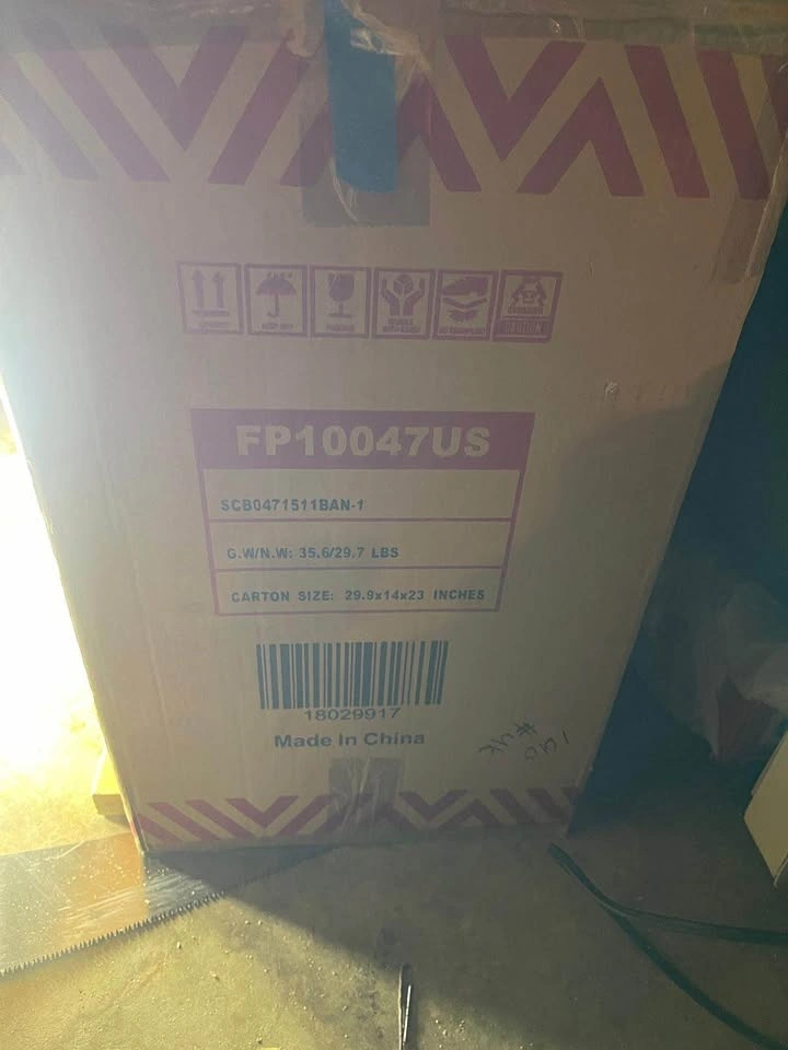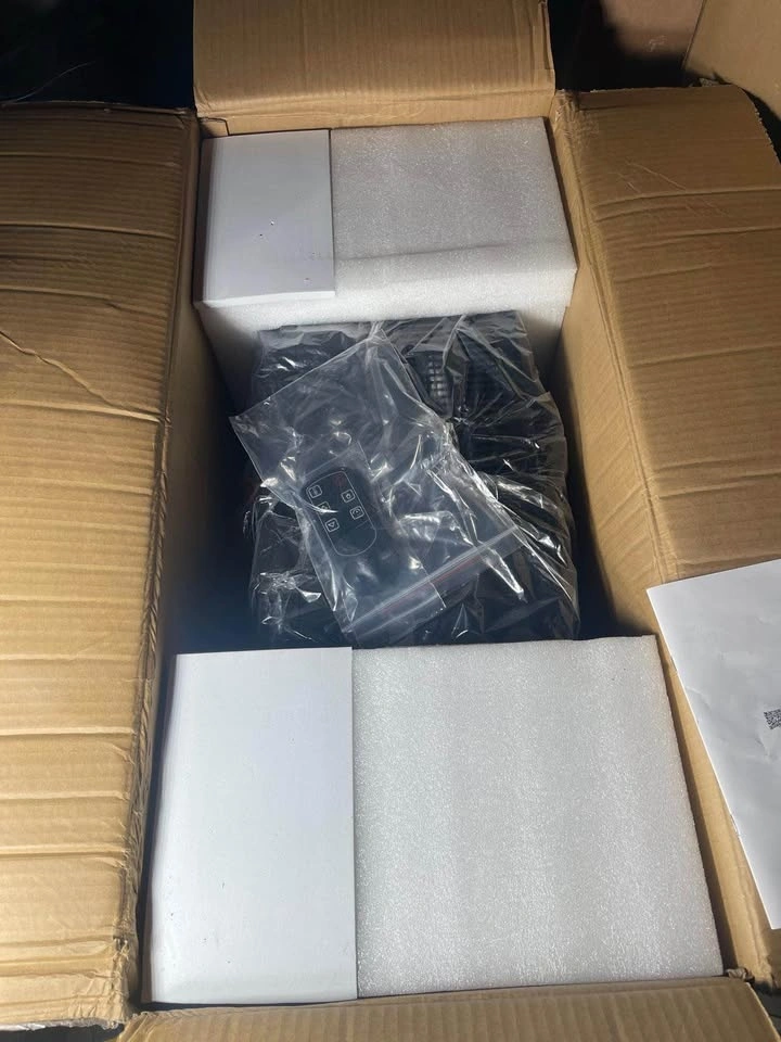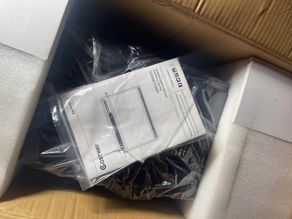 This is a new electric fireplace heater, still in its original packaging. It includes a remote control and appears to be unused, with all components intact and protected by foam inserts.