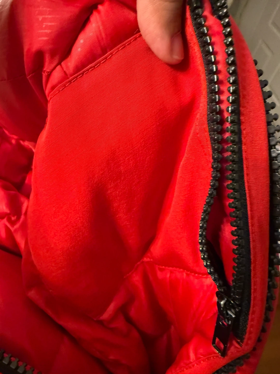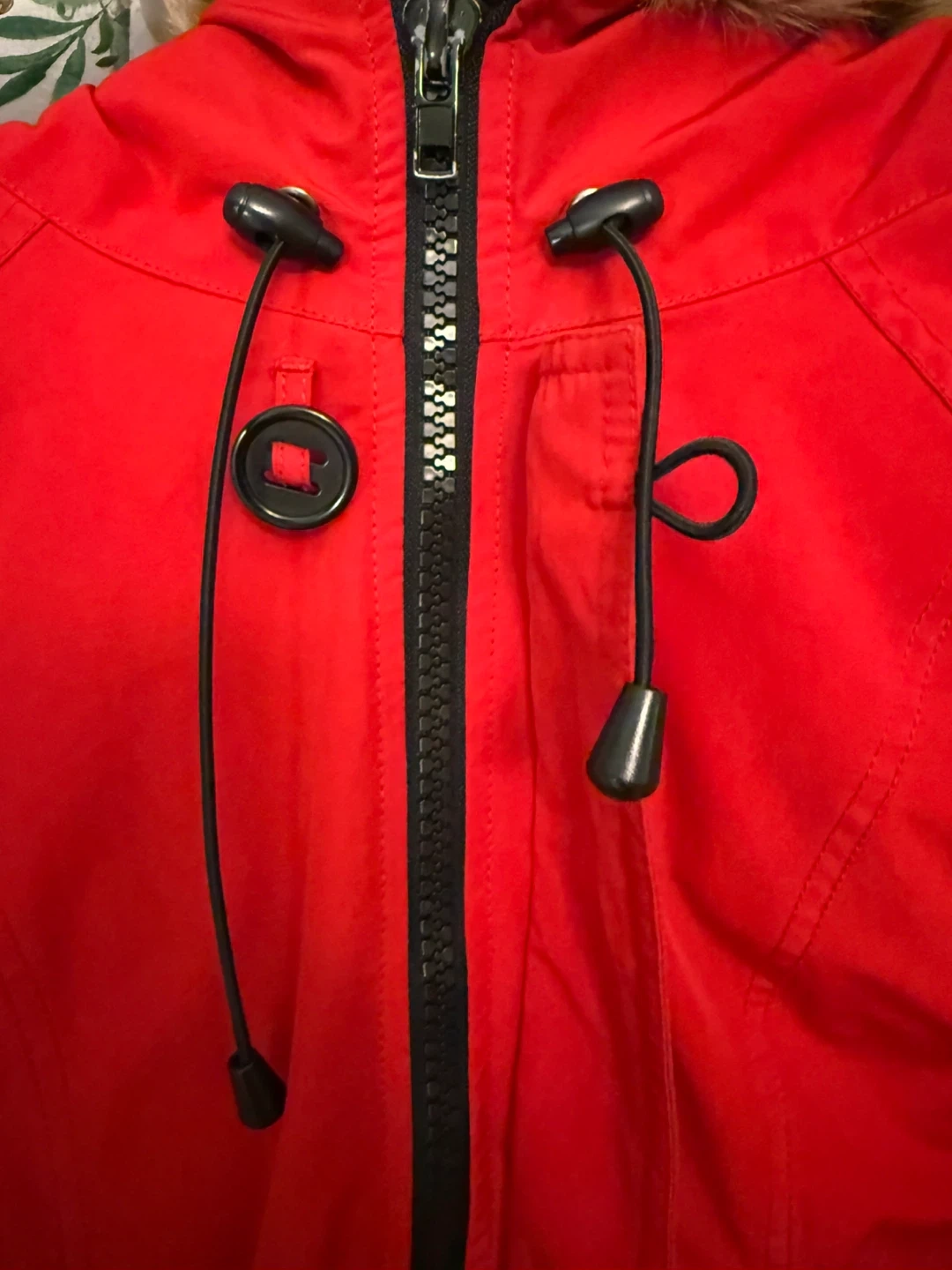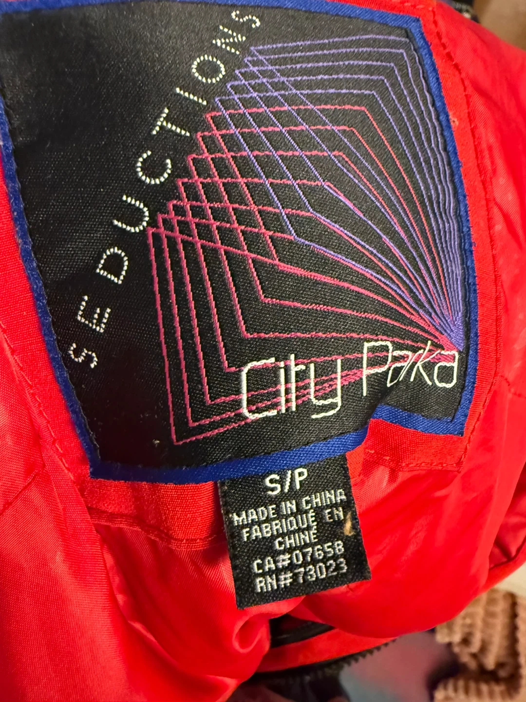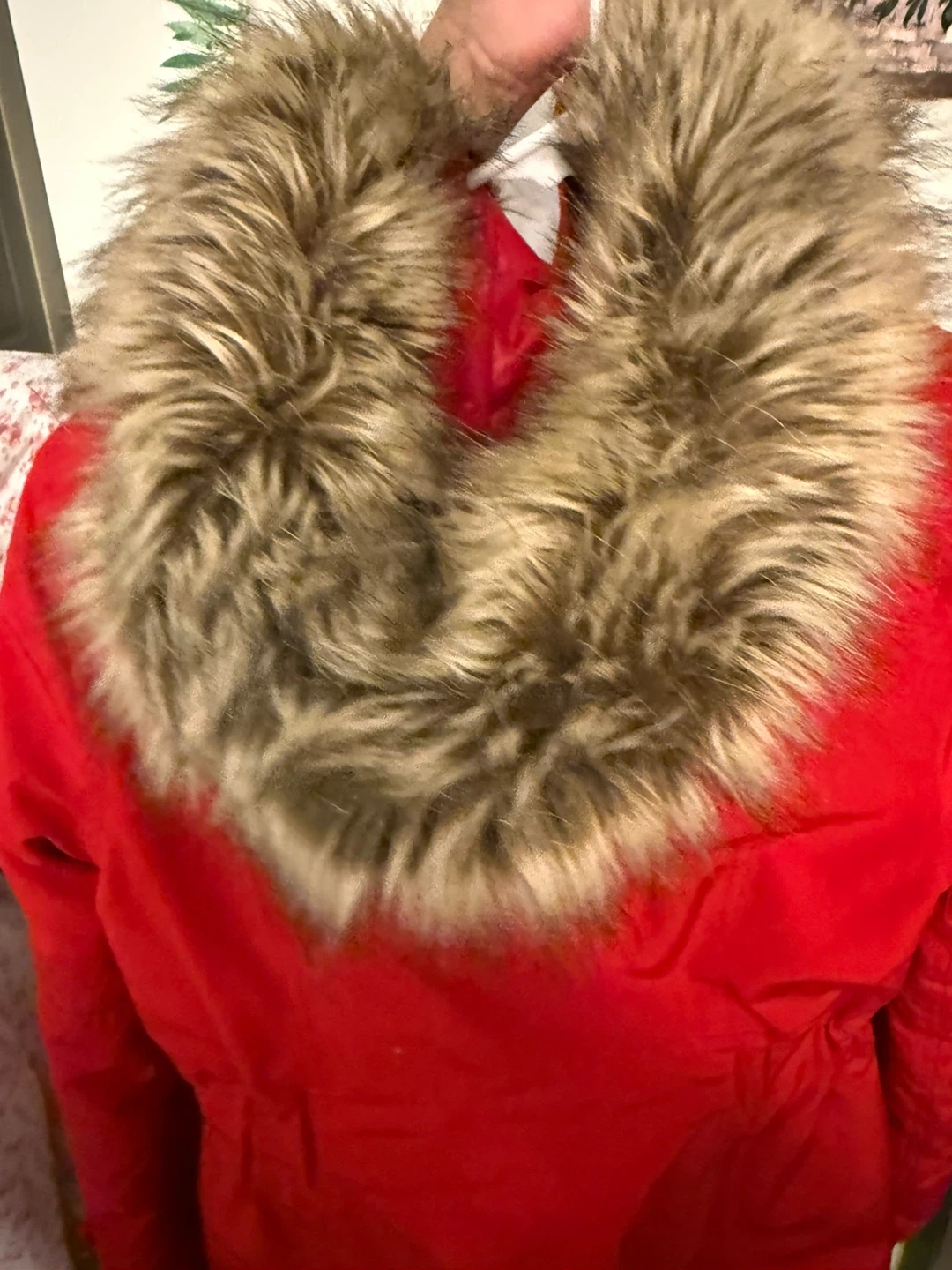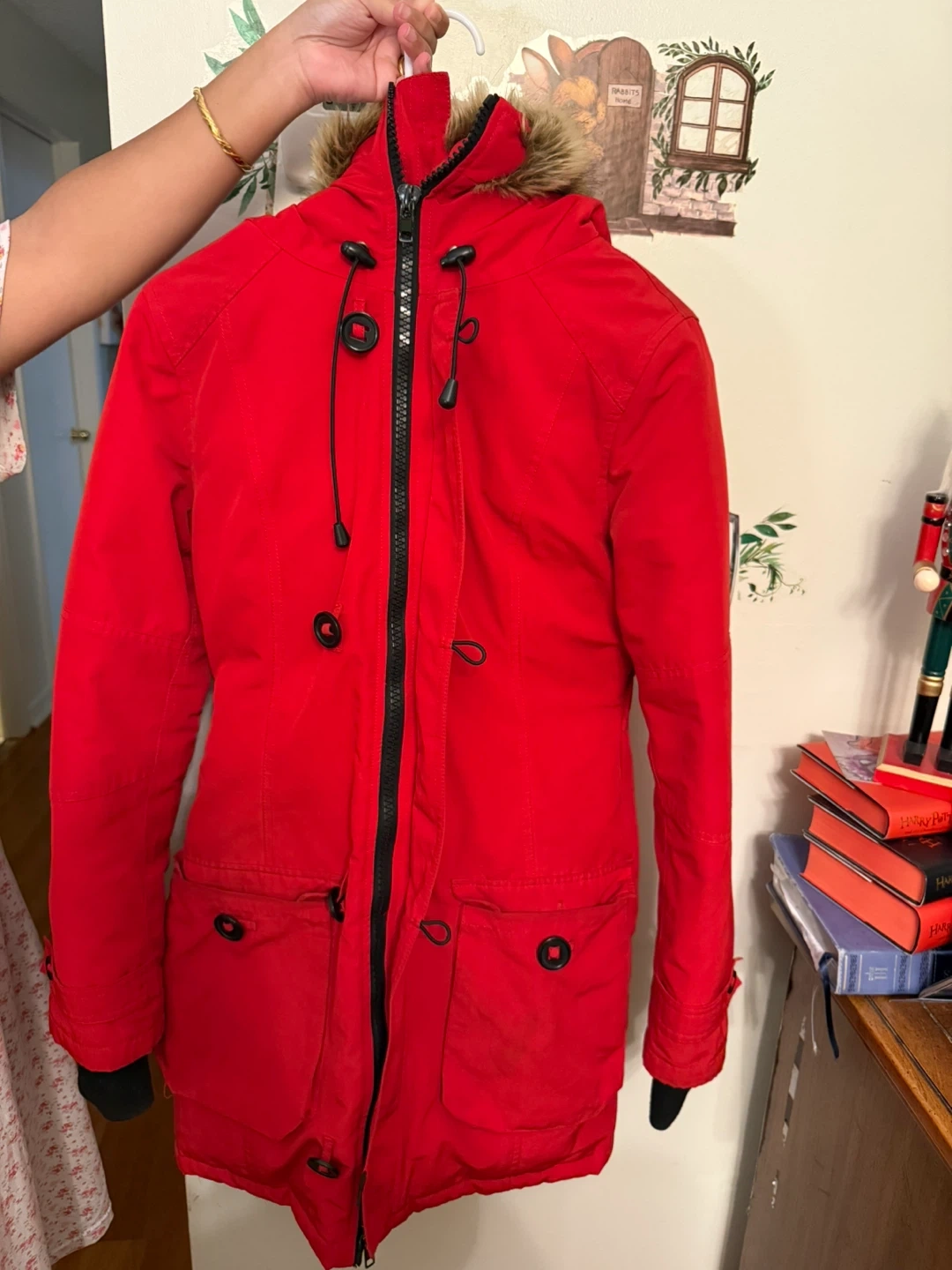 Selling a red Seductions City Parka in size small. It's in great condition and perfect for the colder weather! The parka features a faux fur-trimmed hood and a full-zip front with button closures. It's a stylish and warm choice for the winter season
