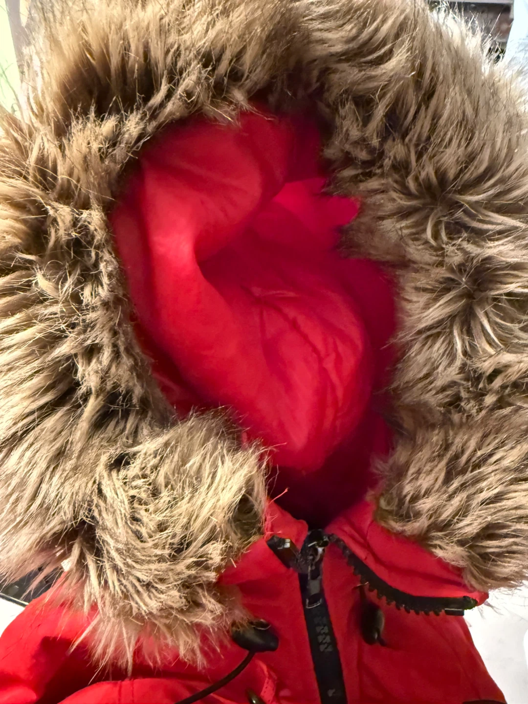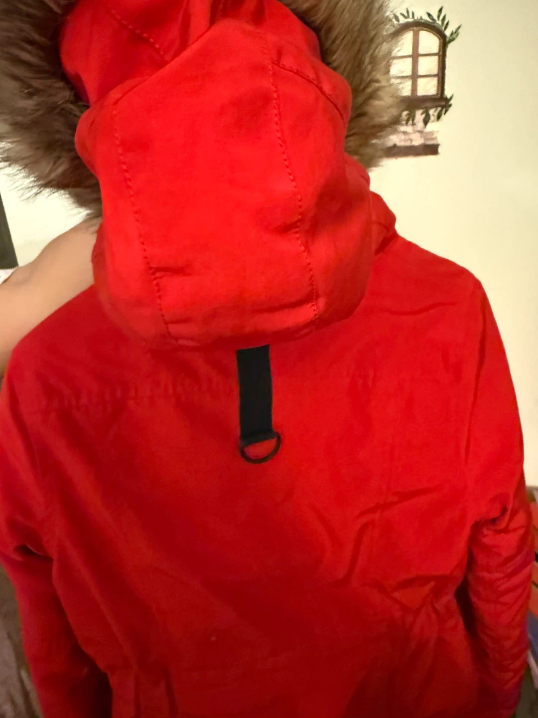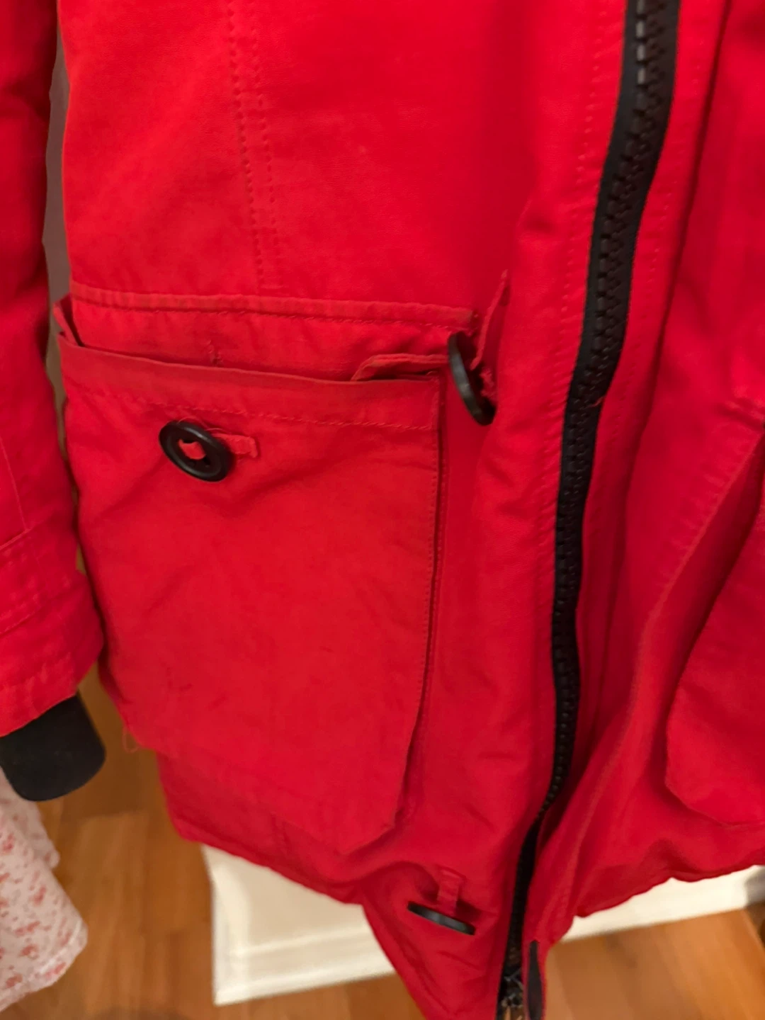 Selling a red Seductions City Parka in size small. It's in great condition and perfect for the colder weather! The parka features a faux fur-trimmed hood and a full-zip front with button closures. It's a stylish and warm choice for the winter season