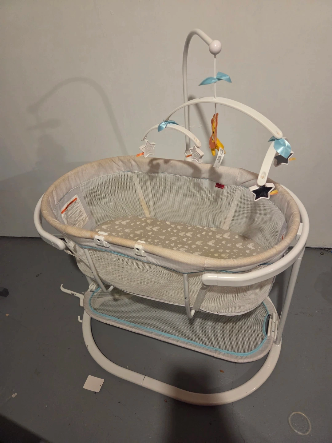 This Fisher-Price Soothing Motions Bassinet gently rocks to soothe your little one. It includes a mobile with plush toys and a soft mattress pad. The mesh sides offer good ventilation.