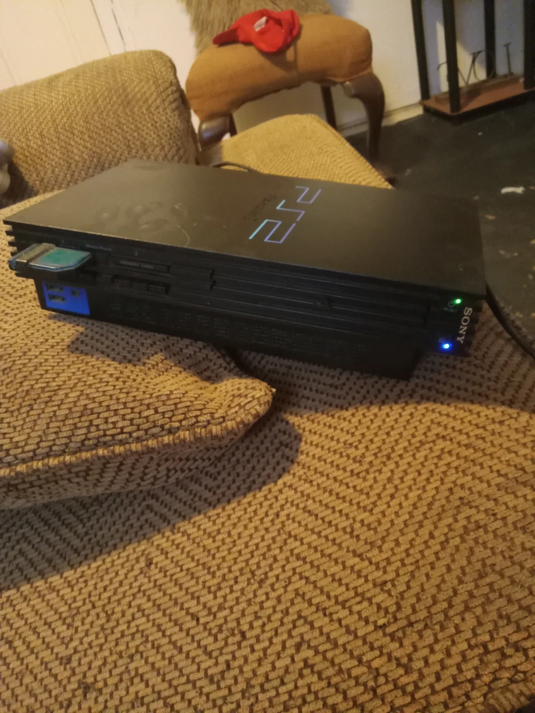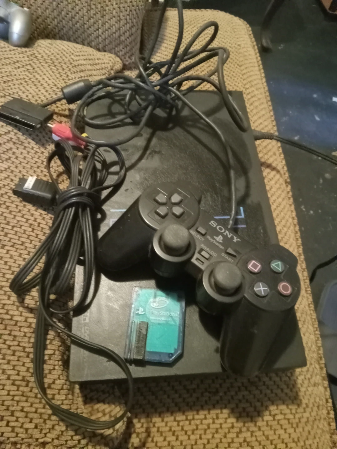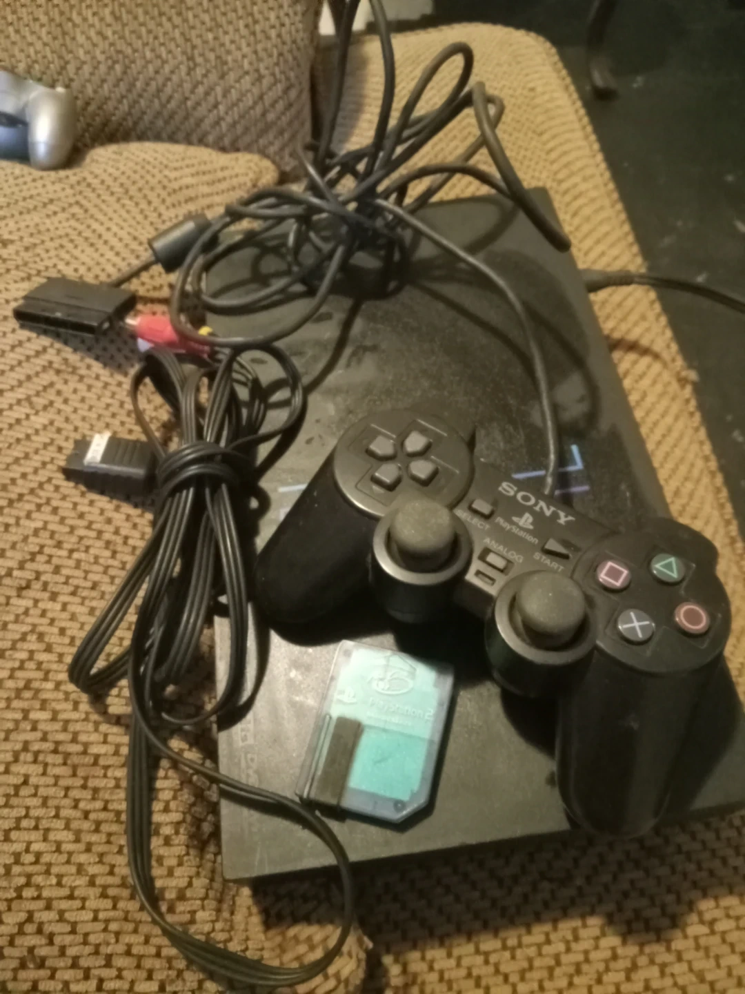 This is a Sony PlayStation 2 gaming console. It comes with one controller, a memory card, and all necessary cables. Get ready for some classic gaming fun!