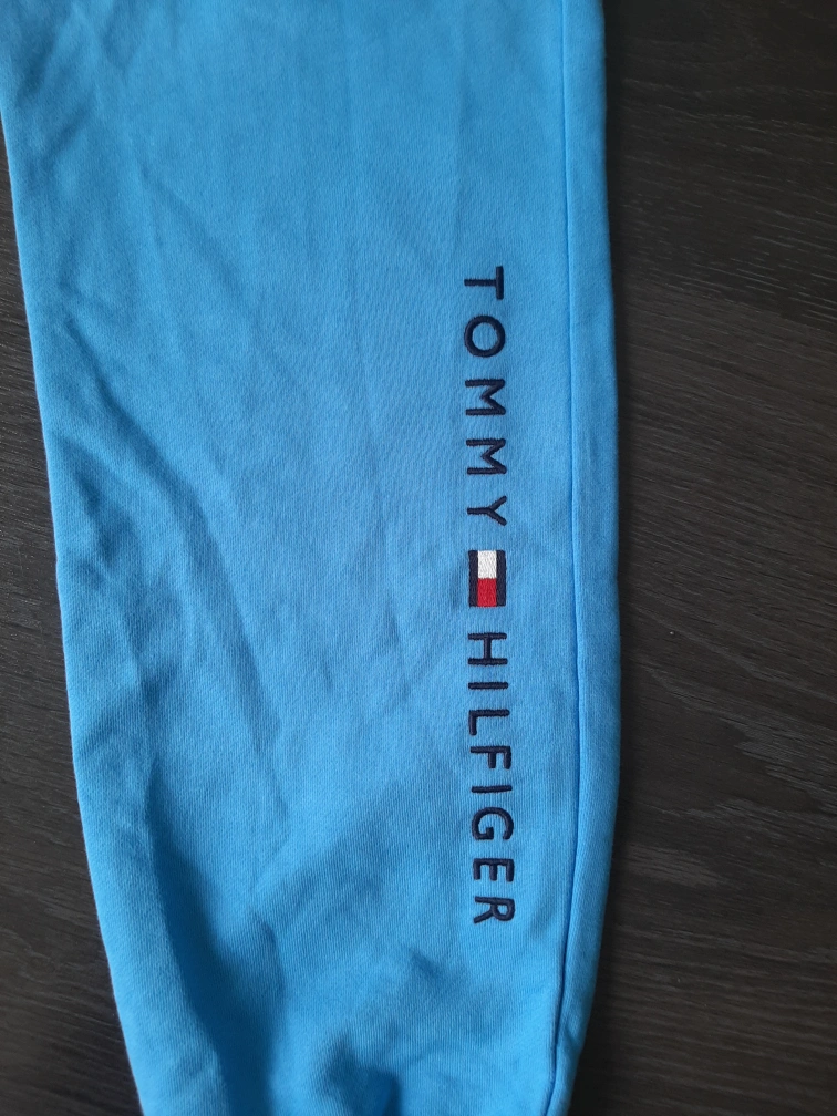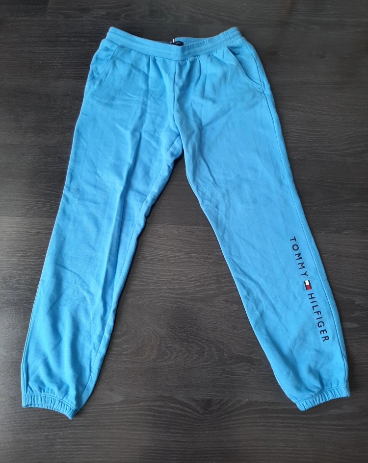 Women's Tommy Hilfiger joggers. Size small/medium. Light blue colour. 100% cotton. Made in India. Elastic waistband and cuffs. Side pockets. Tommy Hilfiger logo on leg.