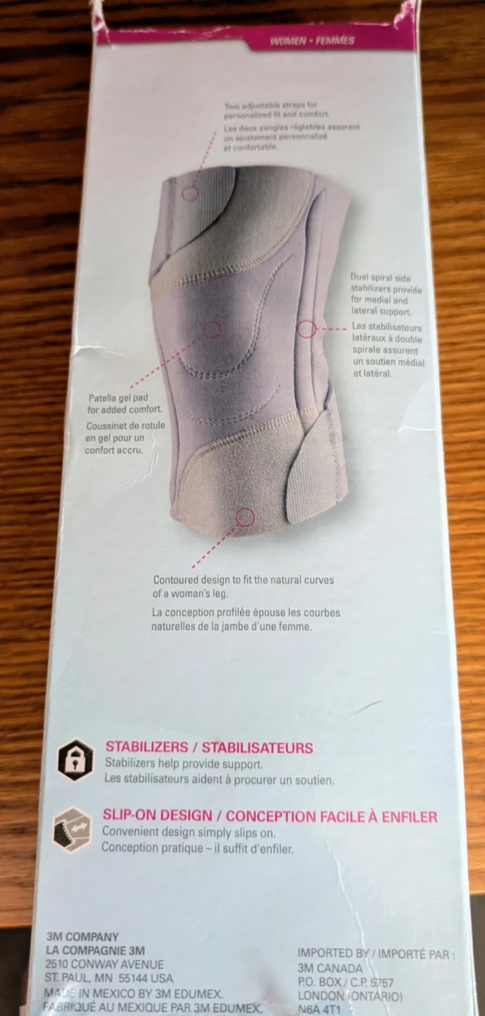 This 3M knee brace offers patella support with a gel pad for added comfort. It features dual spiral side stabilizers for medial and lateral support. Contoured design fits a woman's leg.
