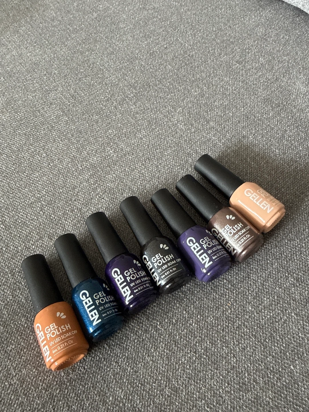 This is a set of seven Gellen gel polish bottles. Each bottle contains 6ml of UV LED soak-off polish. Offers a variety of colours for nail art projects.