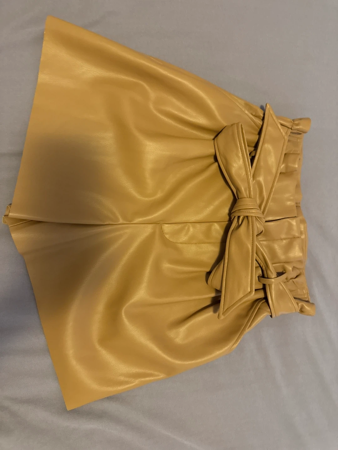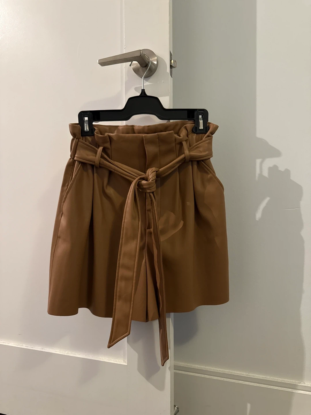 Selling a pair of tan-coloured paper bag style shorts! They are in great condition and would look great with a tucked in top. The material feels like leather. Perfect for a night out or a casual day.