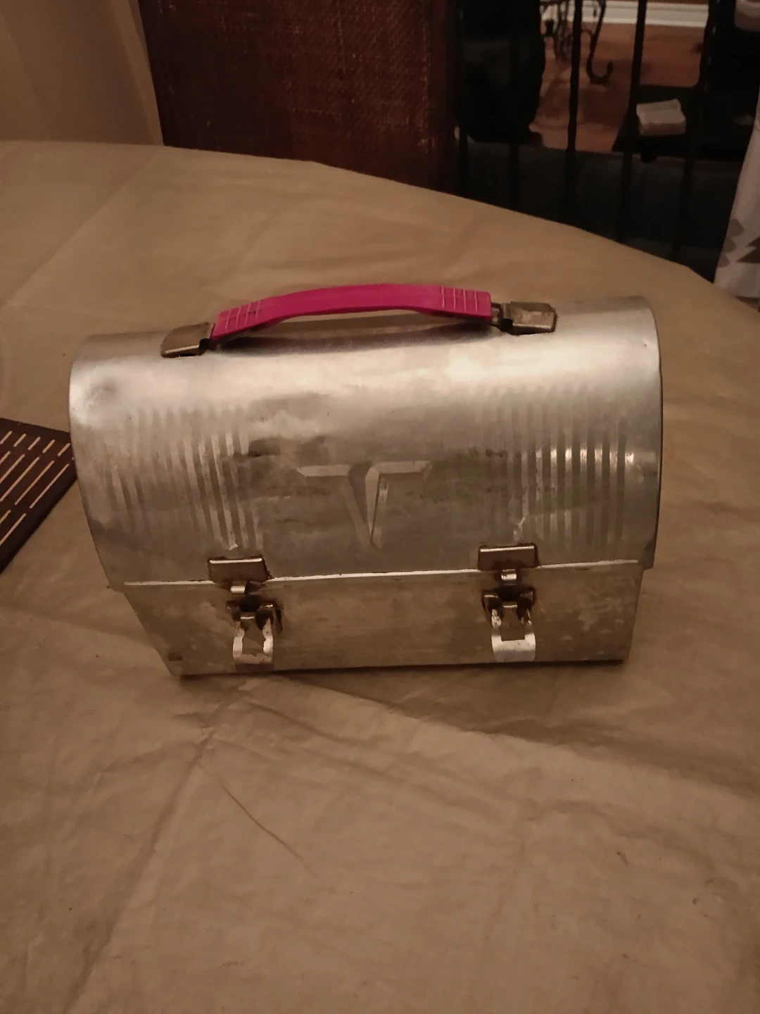 Selling a vintage metal lunchbox. It has a pink handle and some minor signs of wear, but it's in overall good condition for its age. Perfect for collectors or anyone looking for a unique piece!