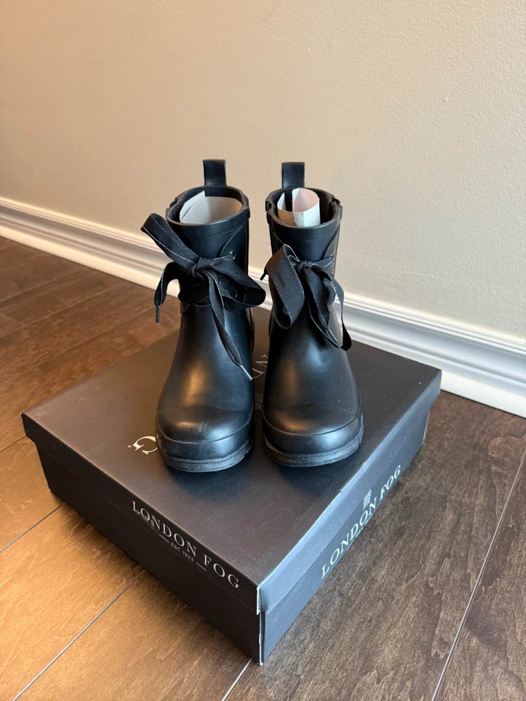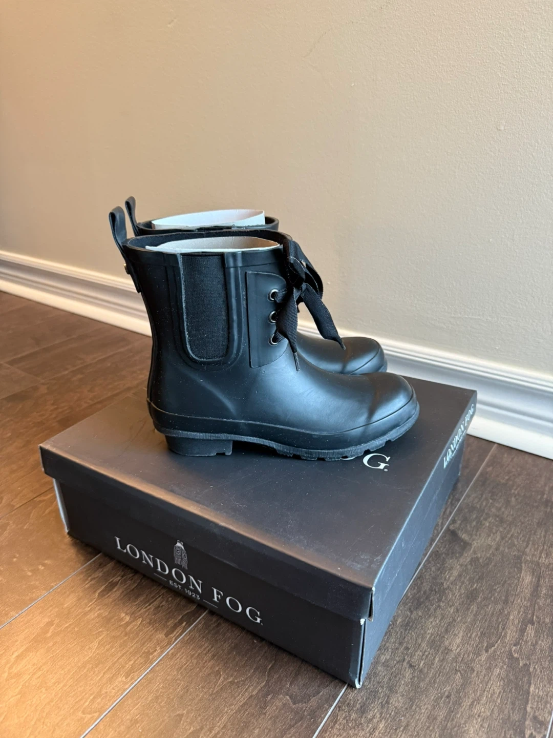 Selling a pair of London Fog black rain boots in size 6! These are in great condition and come with the original box. Perfect for rainy days!