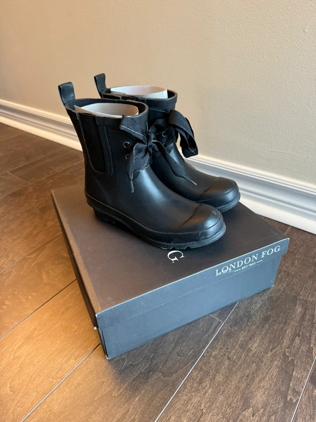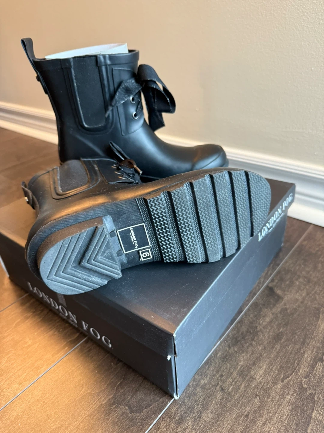 Selling a pair of London Fog black rain boots in size 6! These are in great condition and come with the original box. Perfect for rainy days!