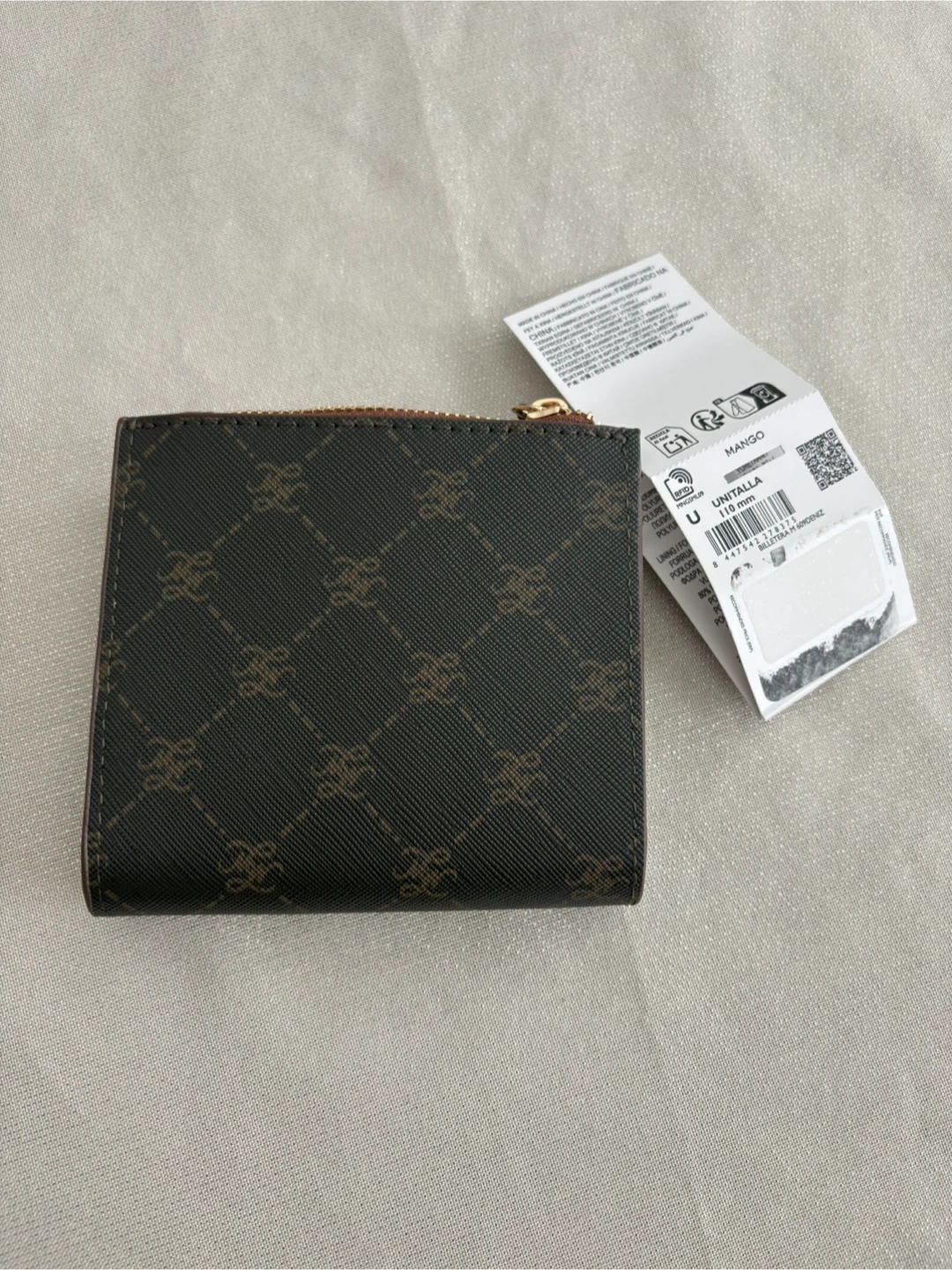 This MANGO bi-fold wallet features a brown monogram print with a faux leather snap closure. It has multiple card slots inside and a zippered coin pocket. 80% Polyurethane, 20% Polyester exterior.