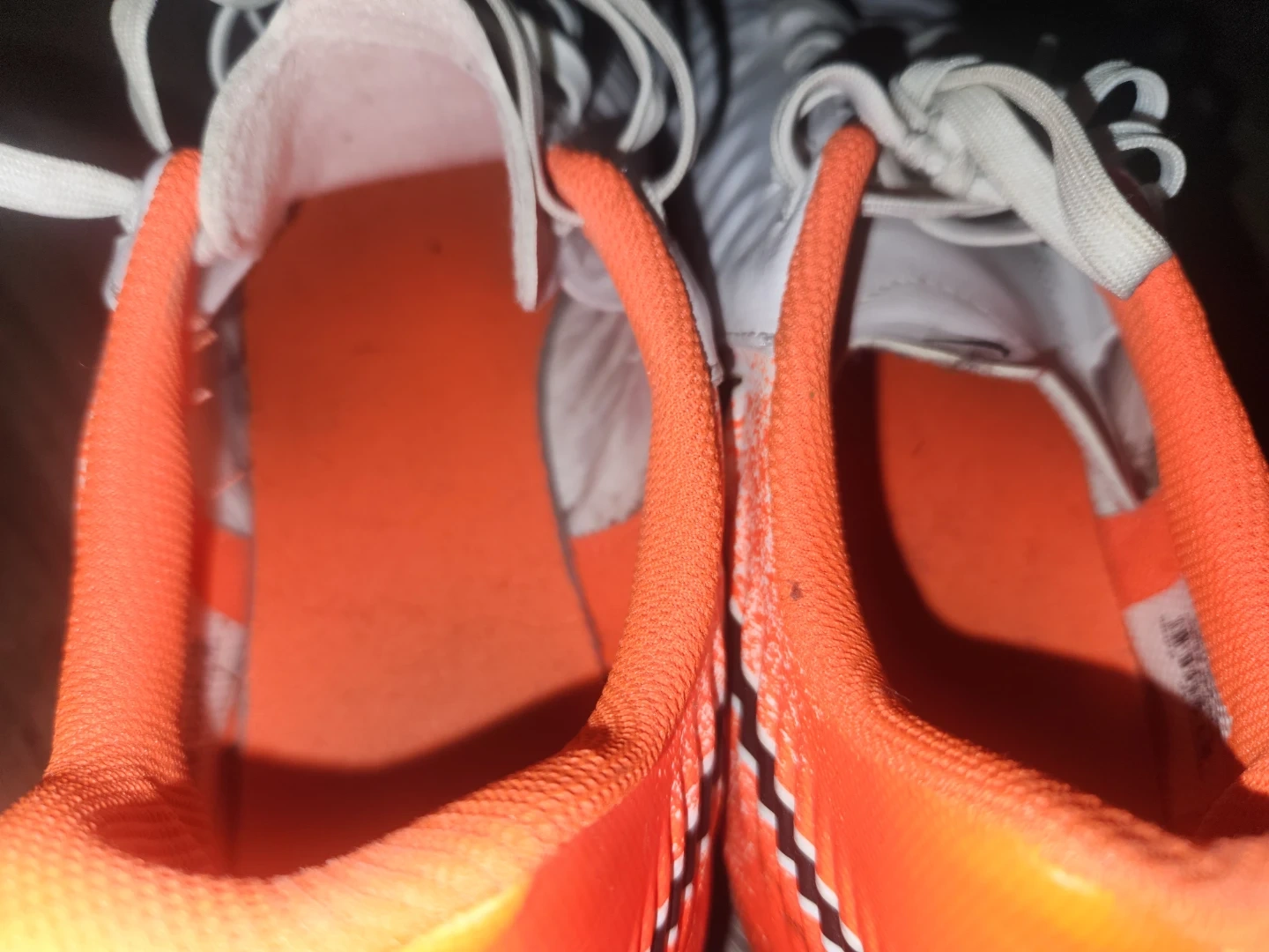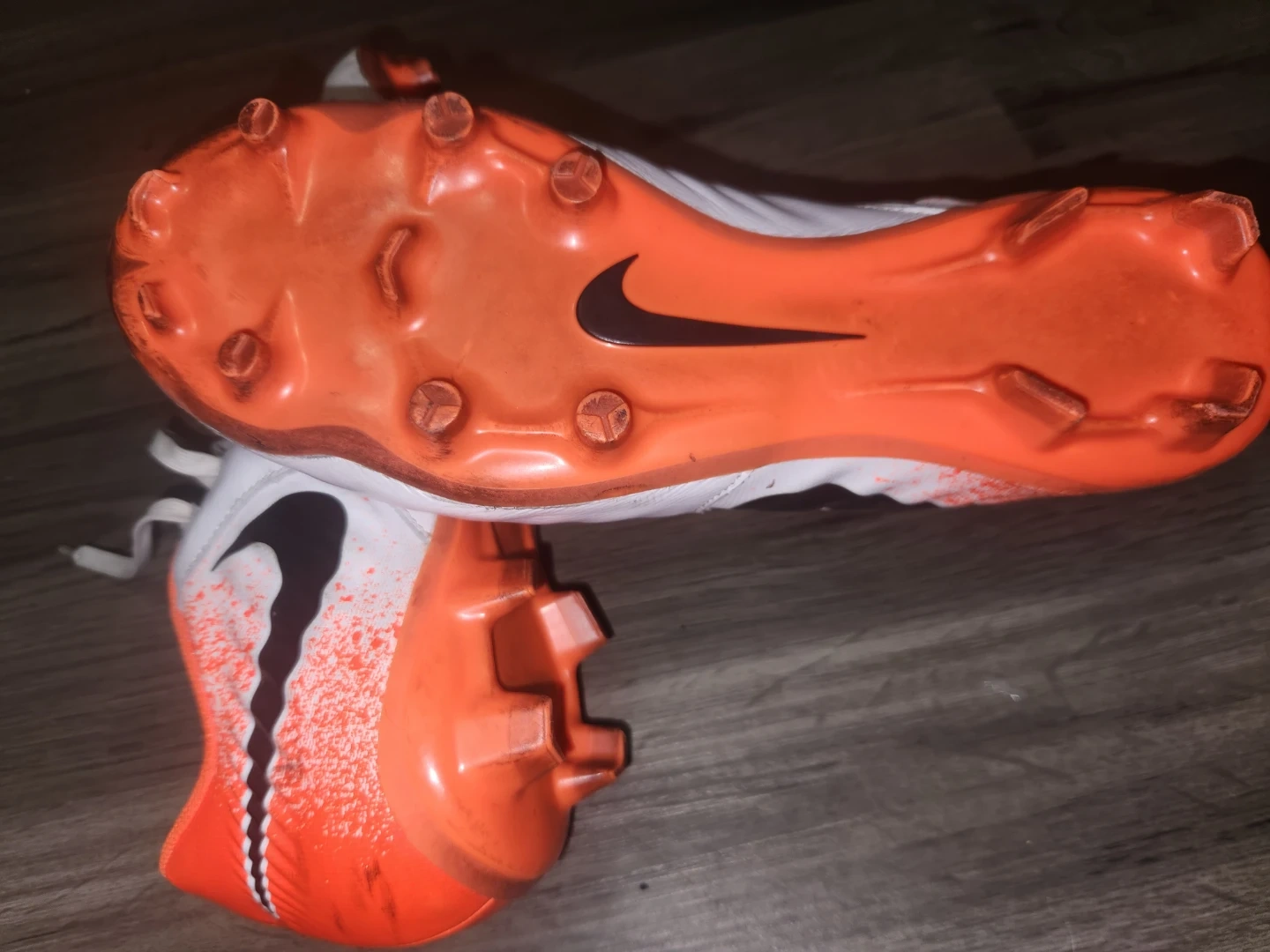 Nike football cleats in white with orange accents. These soccer shoes feature a lace-up closure and durable cleats for traction on the field. They're great for playing soccer!
