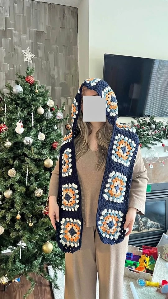 Handmade crochet hooded scarf. Made with soft, warm, and good quality yarns. Features granny squares for a classic look with a modern design. Can be worn as a balaclava or just a scarf. One size fits all. Perfect for winter gifting. Available in different colors as shown in the last photo. All items are new. Pick up in Kincora NW.