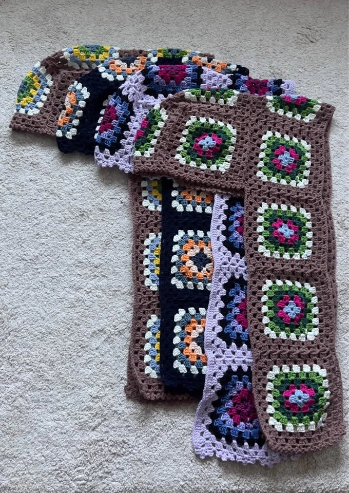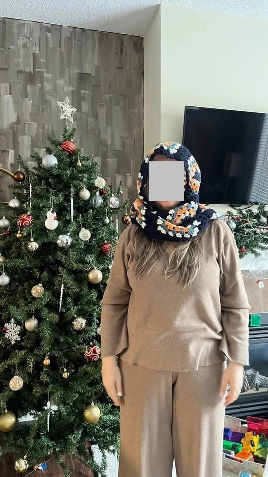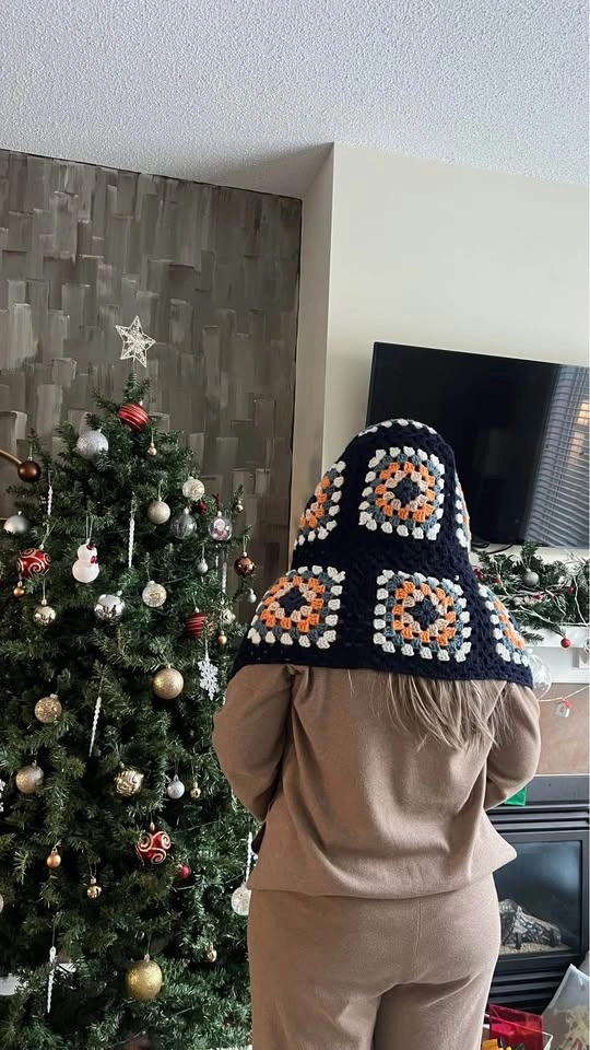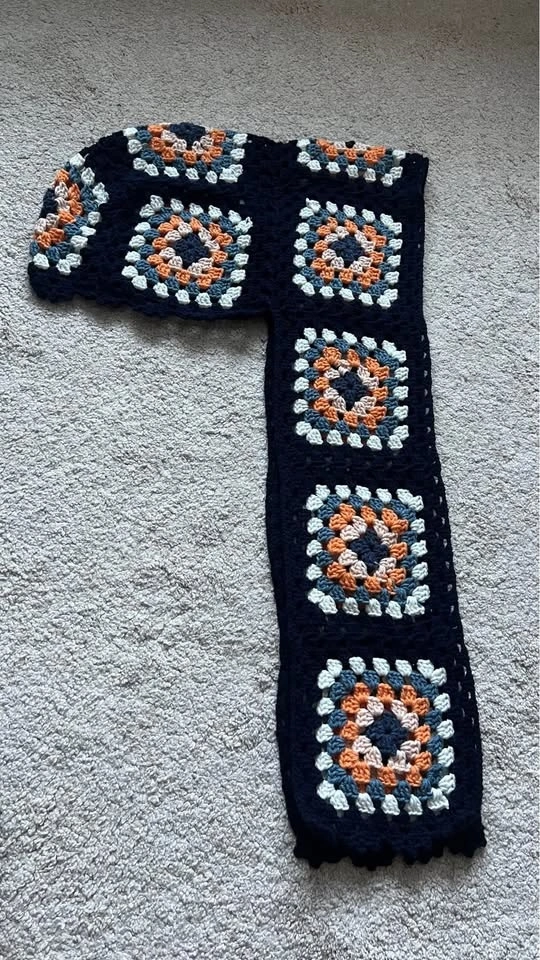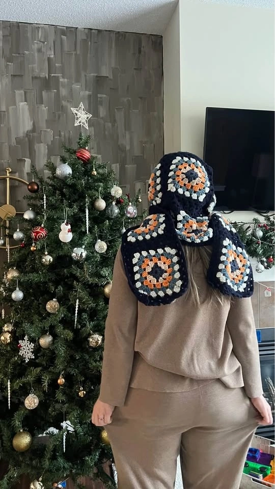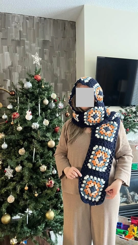 Handmade crochet hooded scarf. Made with soft, warm, and good quality yarns. Features granny squares for a classic look with a modern design. Can be worn as a balaclava or just a scarf. One size fits all. Perfect for winter gifting. Available in different colors as shown in the last photo. All items are new. Pick up in Kincora NW.