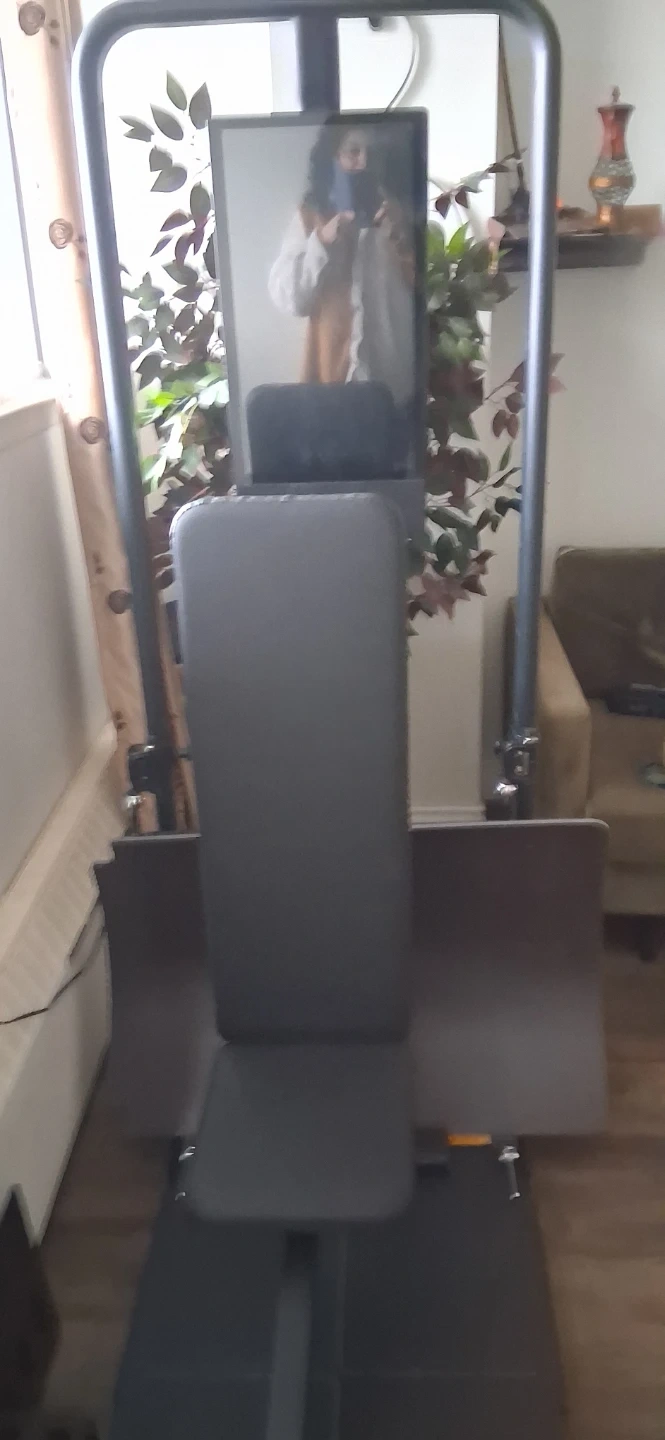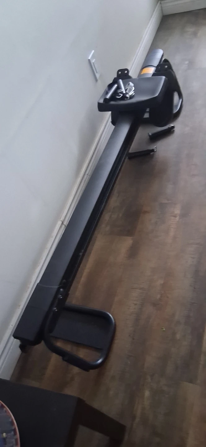 This is a piece of fitness equipment with a seat and a screen. It appears to be a rower or similar exercise machine. It's mostly black with grey padding. This would be great for a home gym setup!