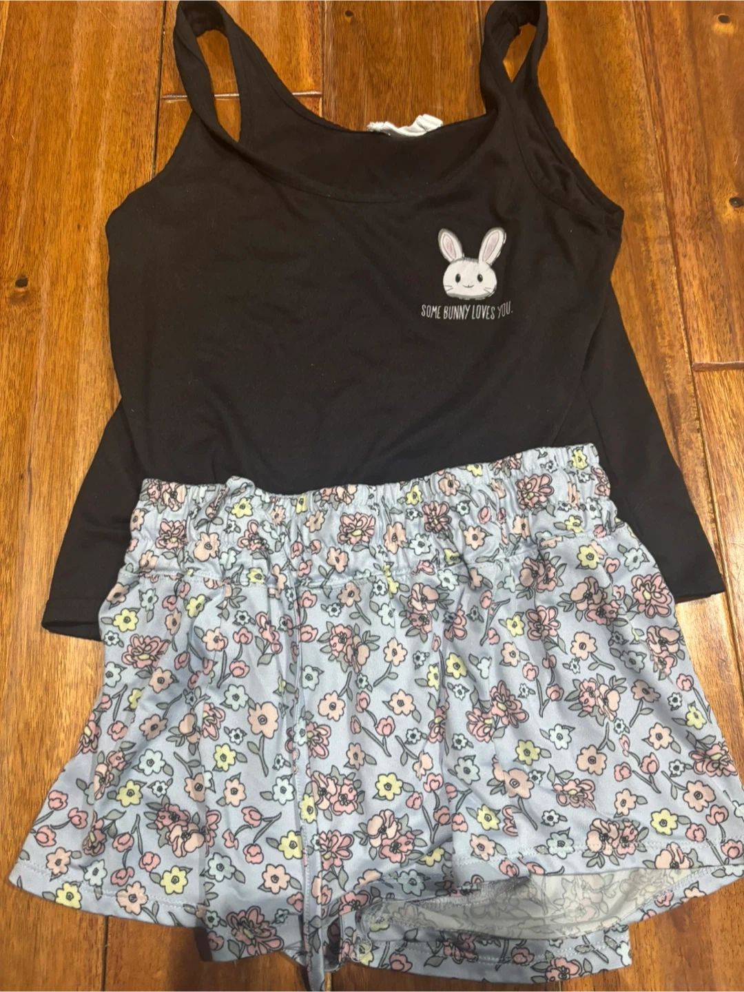 This black cami top has a cute bunny graphic with the text "SOME BUNNY LOVES YOU!". The matching shorts feature a lovely blue floral print. It's a comfy two-piece set for lounging.