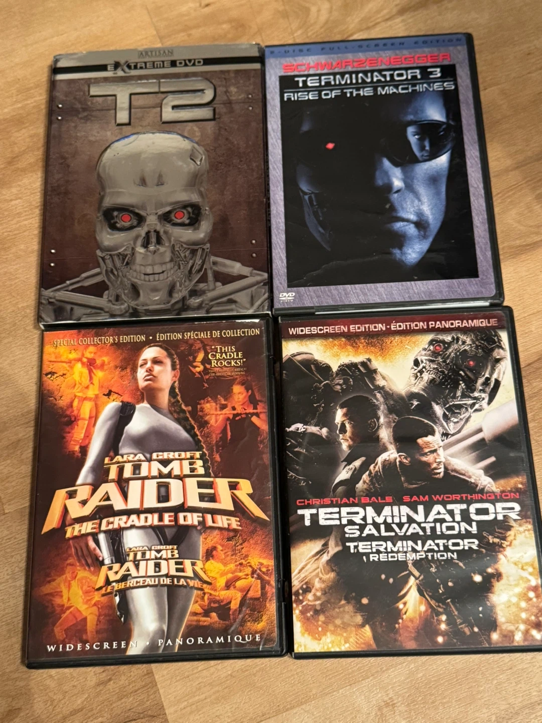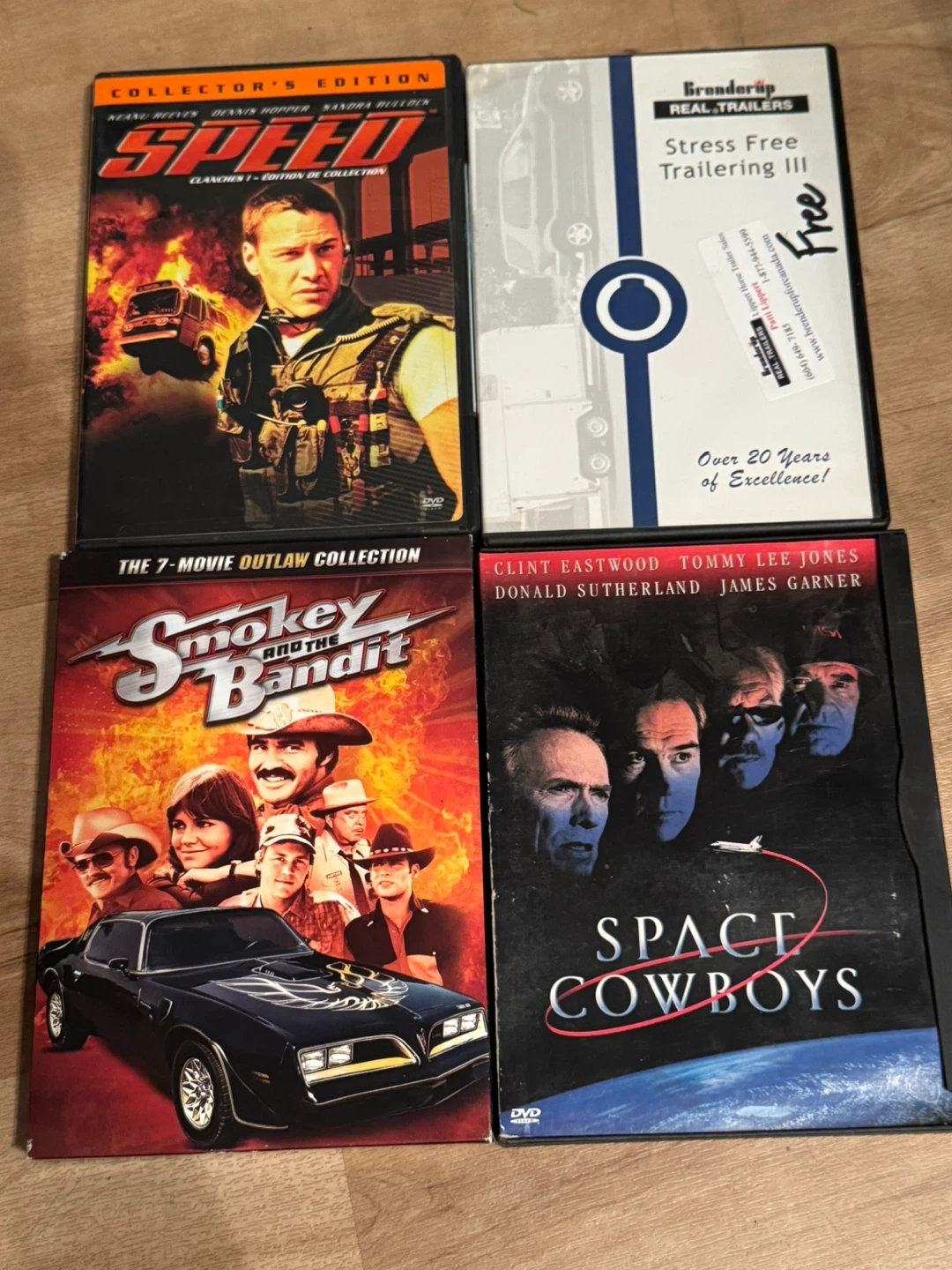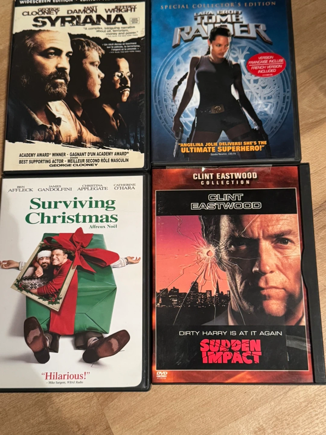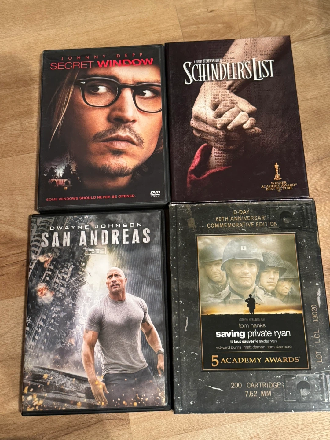 Includes 'Speed', 'Smokey and the Bandit', 'Space Cowboys', 'Secret Window', 'Schindler's List', 'San Andreas', 'Saving Private Ryan', 'Syriana', 'Lara Croft: Tomb Raider' (x2), 'Surviving Christmas', and 'Sudden Impact'. Movies span various genres for your entertainment. $107 for the lot. Located in Penticton