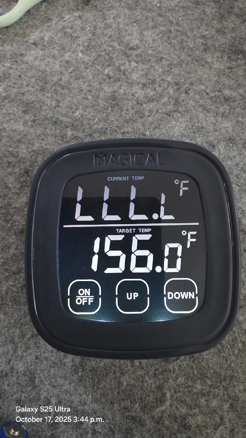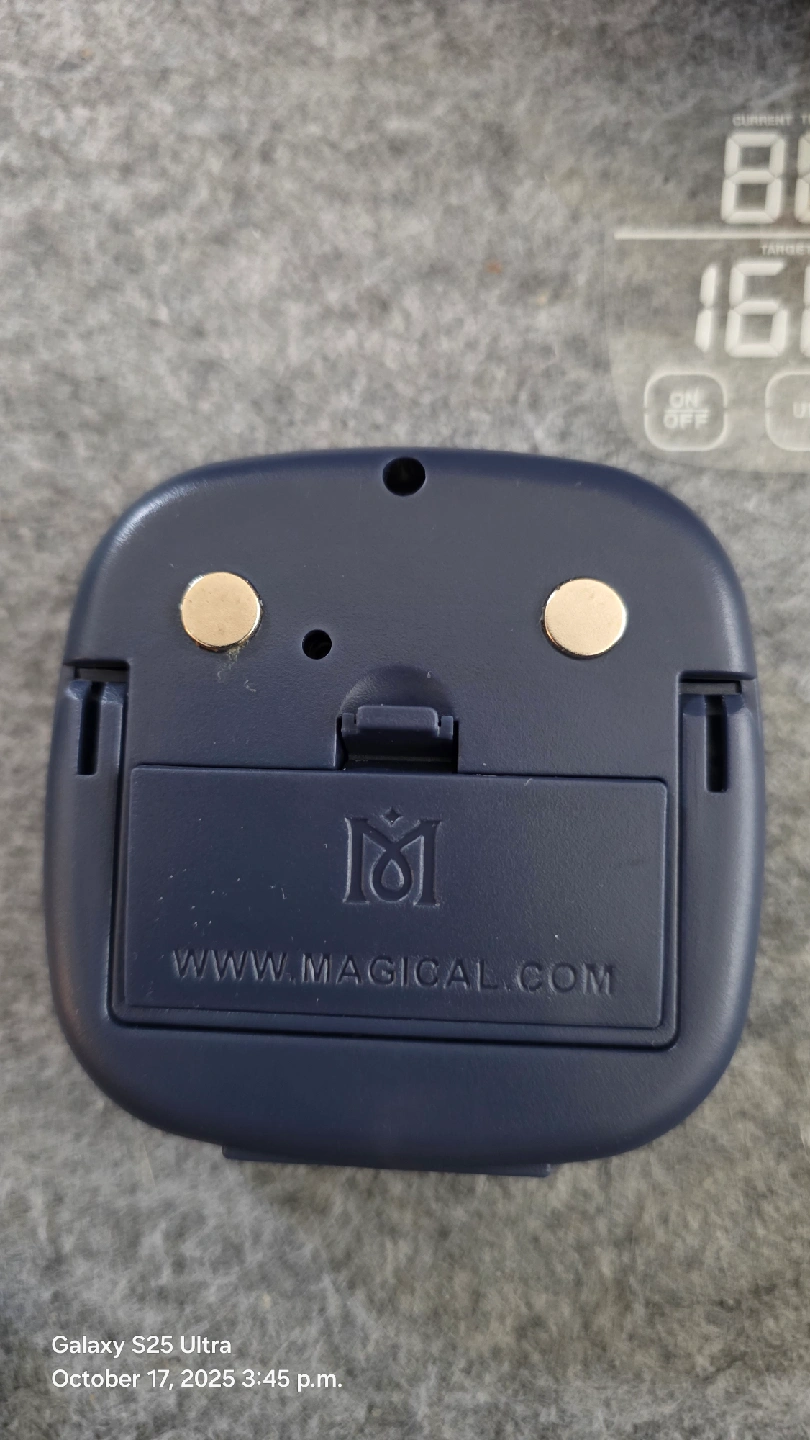 Selling a Magical meat thermometer. It features a digital display for both current and target temperatures. It has a magnetic back for easy storage on your fridge or grill. The display is easy to read, making it simple to monitor your cooking