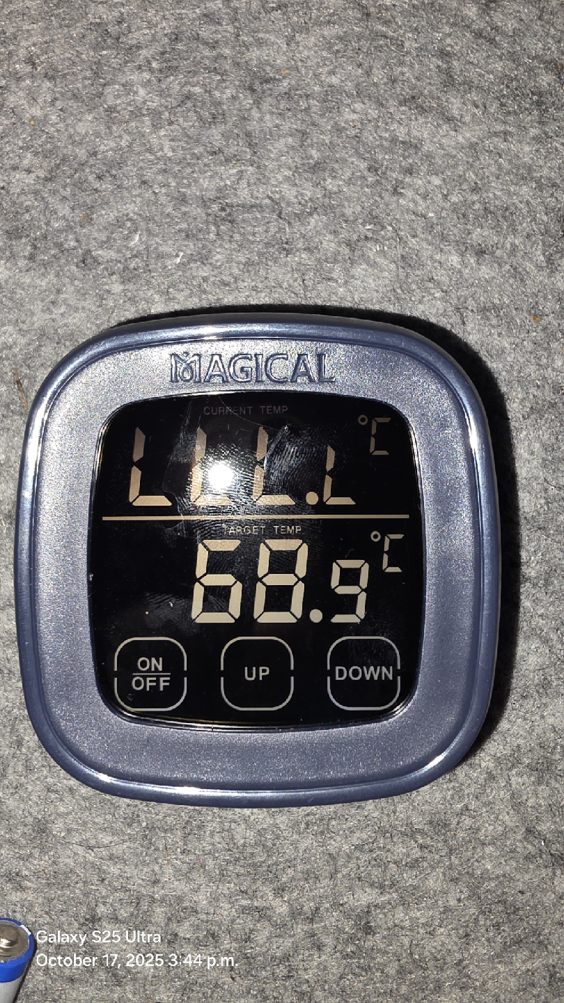 Selling a Magical meat thermometer. It features a digital display for both current and target temperatures. It has a magnetic back for easy storage on your fridge or grill. The display is easy to read, making it simple to monitor your cooking