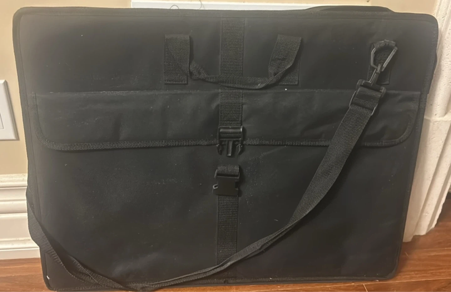 Selling a black art portfolio case. It's in good condition and ready to carry your artwork safely. Features a shoulder strap and buckle closures
